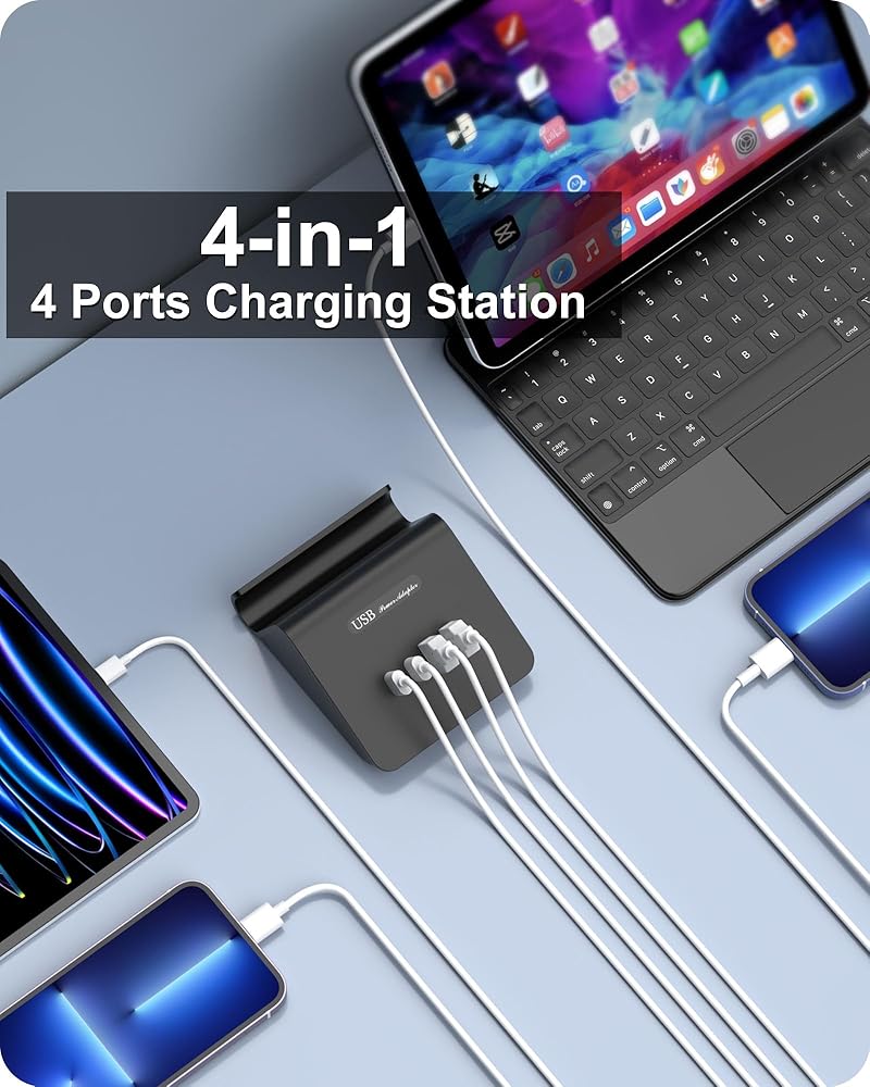 Clutter-Free Charging: 4-in-1 USB charger station allows you to abandon the heavy charging adapter, just get 1 charging station to replace 4 adapter, a perfect desktop charger station for multi-devices user