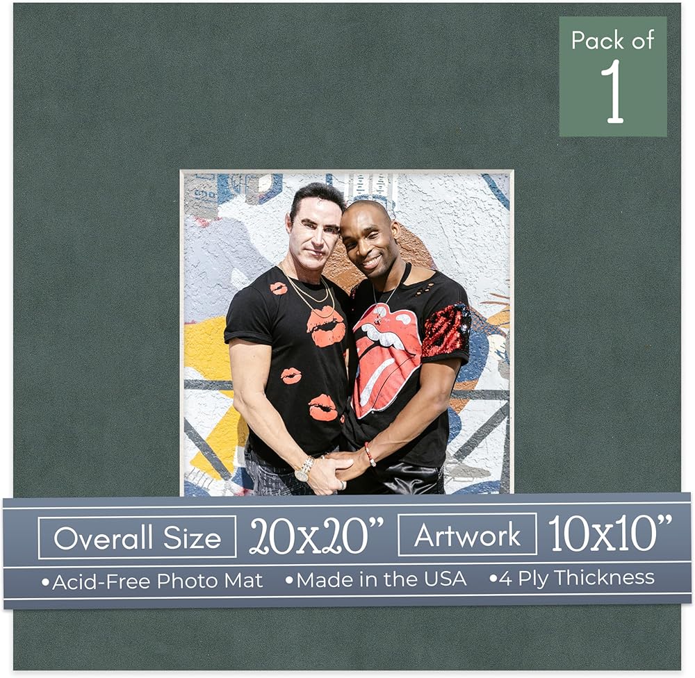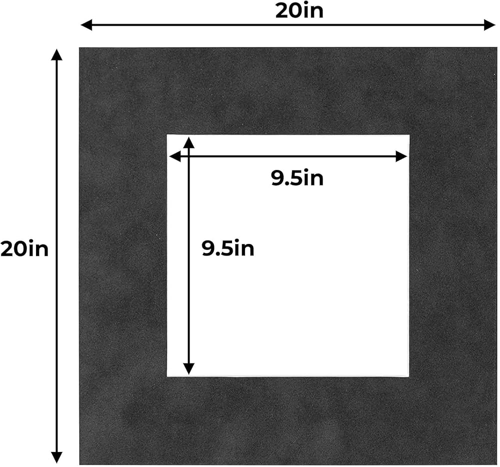 Our Acid-Free matboards are 4-ply and feature a White Core. With an overall size of 20" x 20", these mats fit perfectly into 20" x 20" frames. Each mat is bevel cut to enhance your 10" x 10" photos. The actual mat opening size is 9.5" x 9.5" inches so that it may safely and securely display your 10" x 10" photo, artwork, needlepoint, sign, etc.