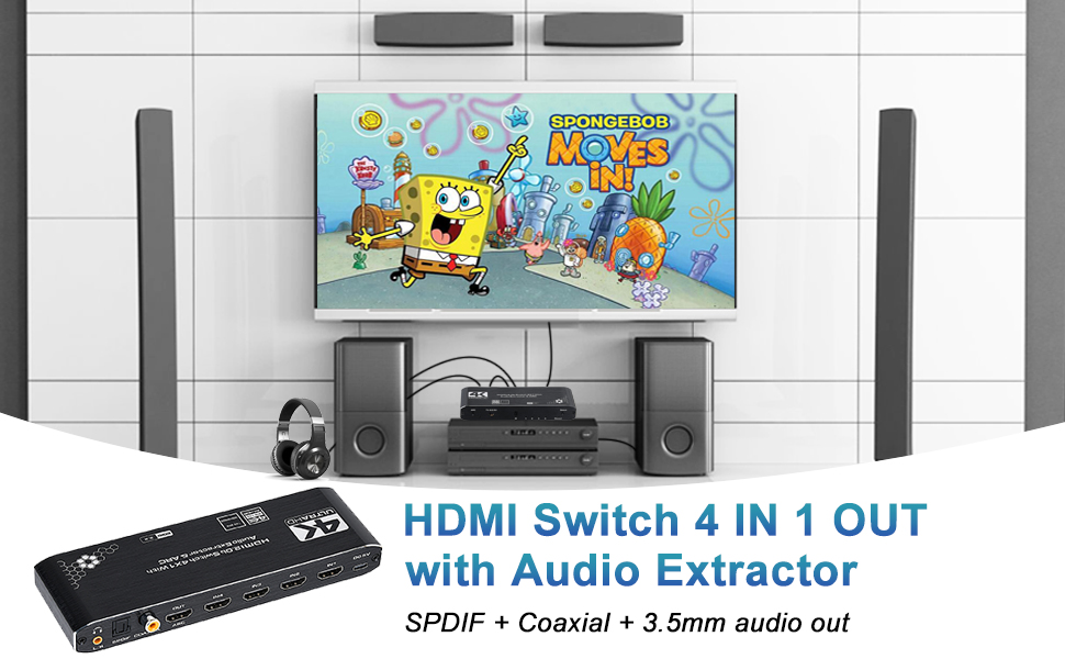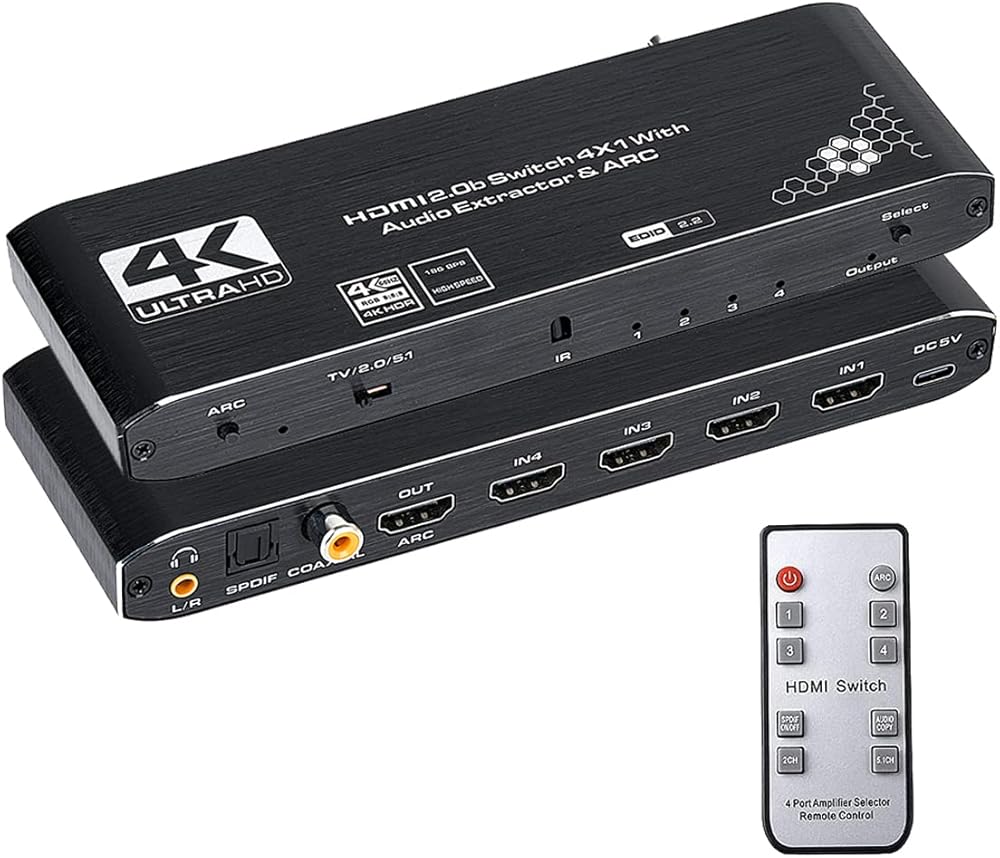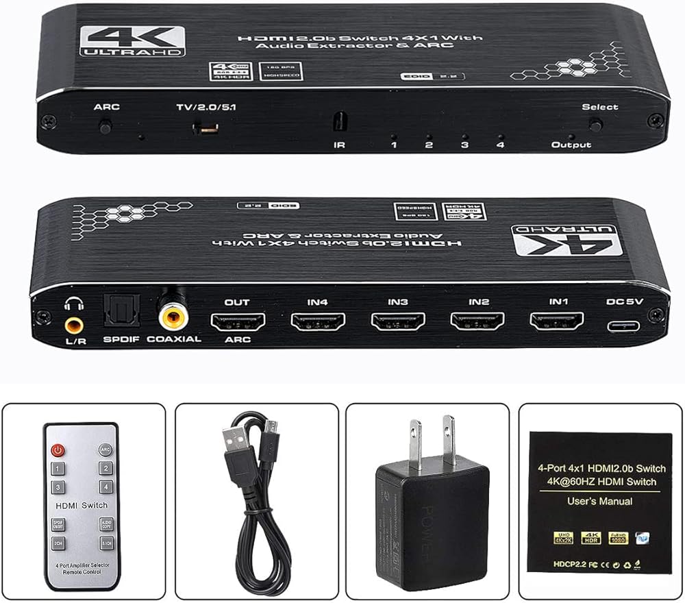 HDMI Switch 4x1 with Optical SPDIF/Coaxial/ 3.5mm L/R Audio Extractor, 4 in 1 Out 4K@60Hz HDMI Switcher Support HDMI 2.0b HDCP 2.2, ARC Function for Xbox, PS4,Blu-Ray Player (with Remote Control)