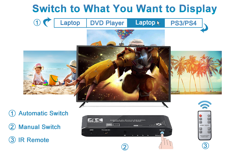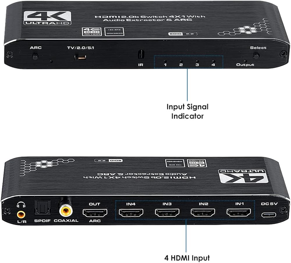 4 Input 1 Output HDMI Switch: This 4 port HDMI switch supports HDCP 2.2, HDMI2.0b,4K @60HZ 4:4:4, RGB4:4:4,Full HD, UHD, Deep Color to 36bit, HDCP2.2, HDMI 2.0b, Max Bandwidth of 18.5Gbps, Support ARC function. It can easily select 4 HDMI sources that scale up to 4K@60Hz to a single HDMI output which your want with Audio Extract Function.The Extract Audio can output by Optical TOSLINK SPDIF, Coaxial, 3.5mm L/R Audio. You can select HDMI Output by a local button or an IR wireless remote control