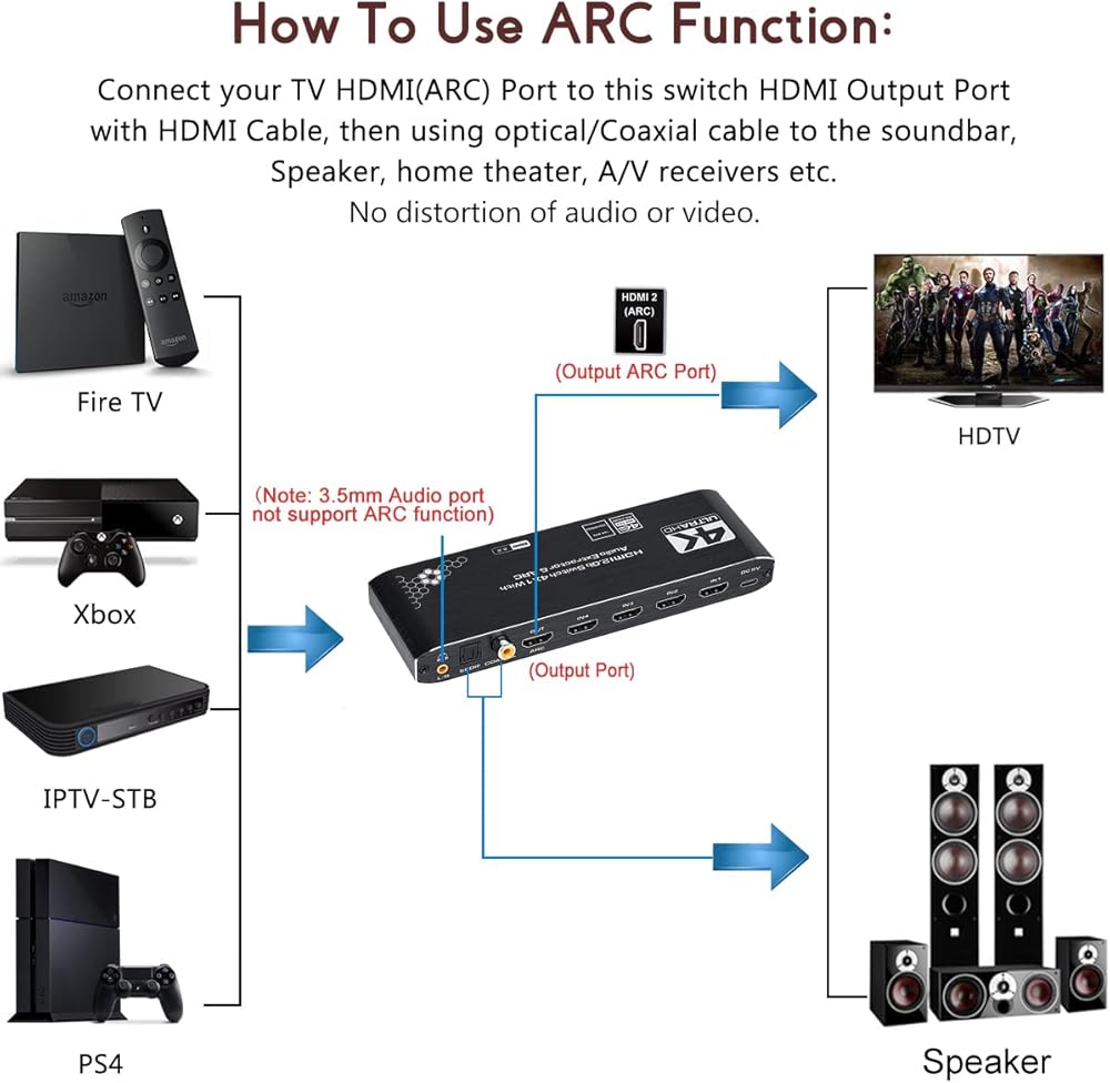 Optical TOSLINK, Coaxial and 3.5mm Audio Interface: This HDMI Switch supports ARC function (Audio Return Channel and audio is available from the TOSLINK and Coaxial Output that you can enjoy a high audio quality) Note:3.5mm audio port not support ARC function; This HDMI Switcher Supports different compressed audio format: Dolby, DTS-HD and also supports Blu-ray 2.1 / 3.1 / 4.1 / 5.1 / 6.1 / 7.1 / 8.1 / 9.1 home theater audio.