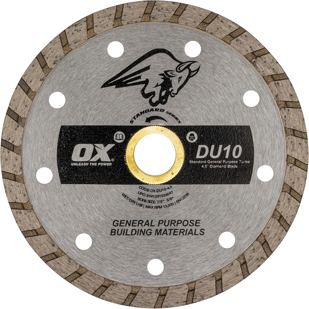 The OX DU10 Standard Series Diamond Blade is a general purpose turbo blade and is used for cutting bricks, blocks, concrete, stone and other masonry materials. This turbo Diamond Blade is designed to work with angle grinders, circular saws, power saws and tile saws and comes with a robust 10mm segment which gives an increased life of 43-Percent. The OX Standard Series range gives the benefit of a safe performing product for the cost conscious user.
