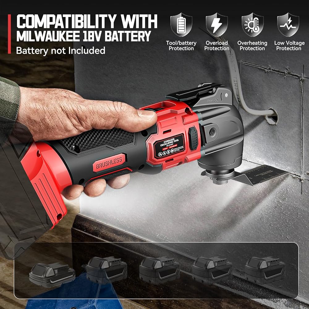 【Multi Tool Compatibility with Milwaukee 18 Battery】Cordless oscillating tool Compatible with Milwaukee 18v lithium-ion batteries. (Note: this product does not include battery)