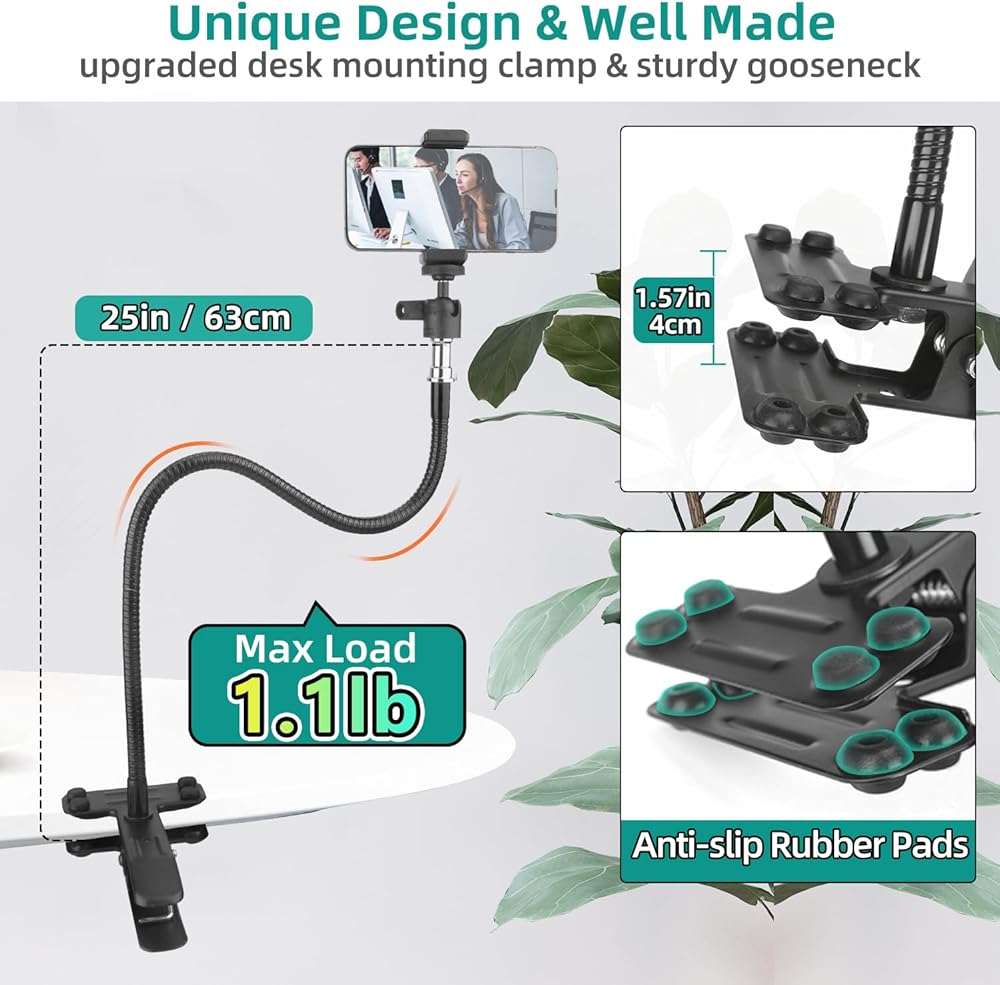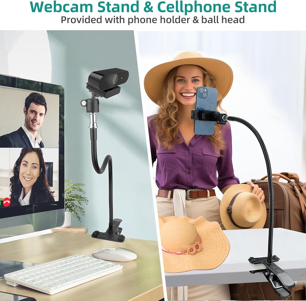 Webcam Stand Camera Mount with Phone Holder& Rotatable Ball Head, 25 Inch Flexible Cell Phone Stand Desk Mount Camera Stand Gooseneck with 1/4" Screw for Webcam, Video Light, Cellphone