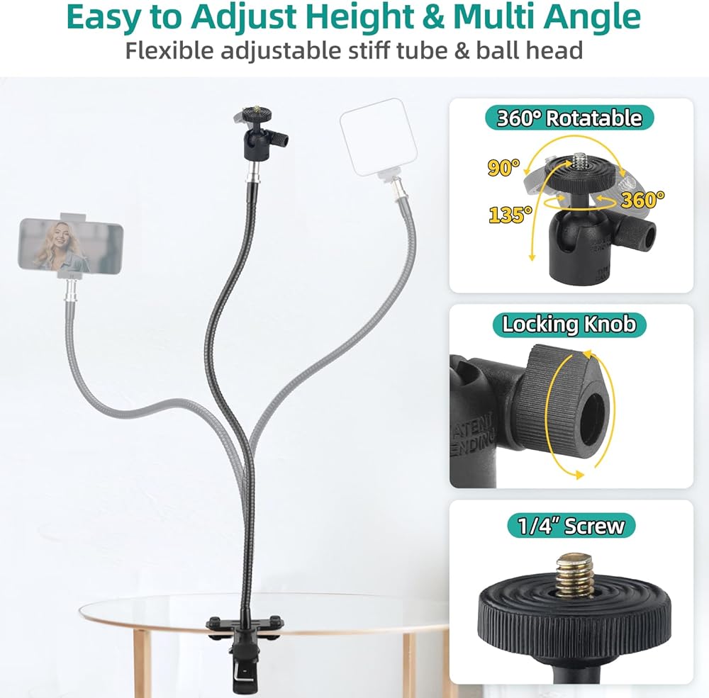 ✨ Flexible Angle Adjustable Ball Head ✨ ❶ The desk mount clamp gooseneck stand comes with a 360° swivel detachable ball head The ball head ensures 360 degree horizontal rotating and -90°/+45° front tilt for multi-angle shooting. ❷Only by rotating the knob can be adjusted to the desired angle to meet your needs without removing the devices