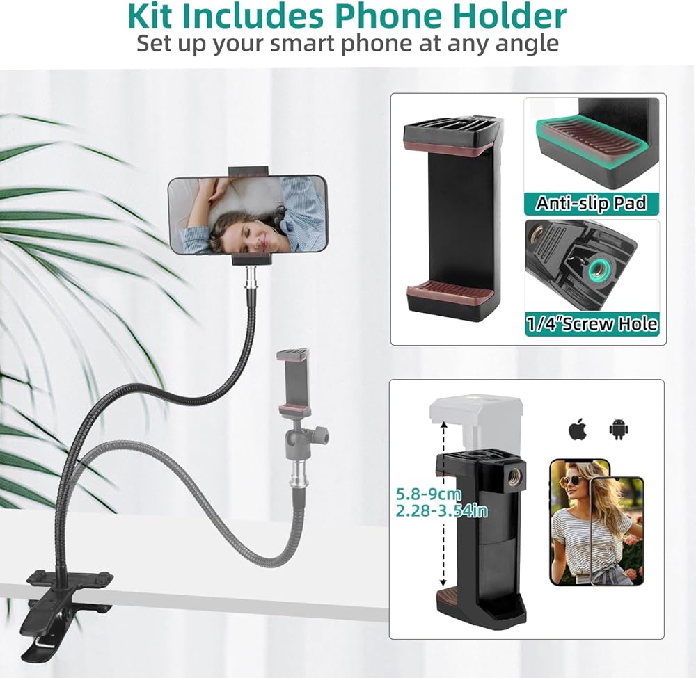 ✨ Cell Phone Holder✨ ❶ There is a 1/4 screw hole on the side and bottom of the phone mount, which can be directly fixed on a ball head, tripod, light stand and other devices with a 1/4”screw. ❷The smartphnone clip is designed with anti-slip rubber to protect your smartphone from falling. ❸NOTE: This cellphone holder fits for any cell phone within 2.2-3.5inch width.