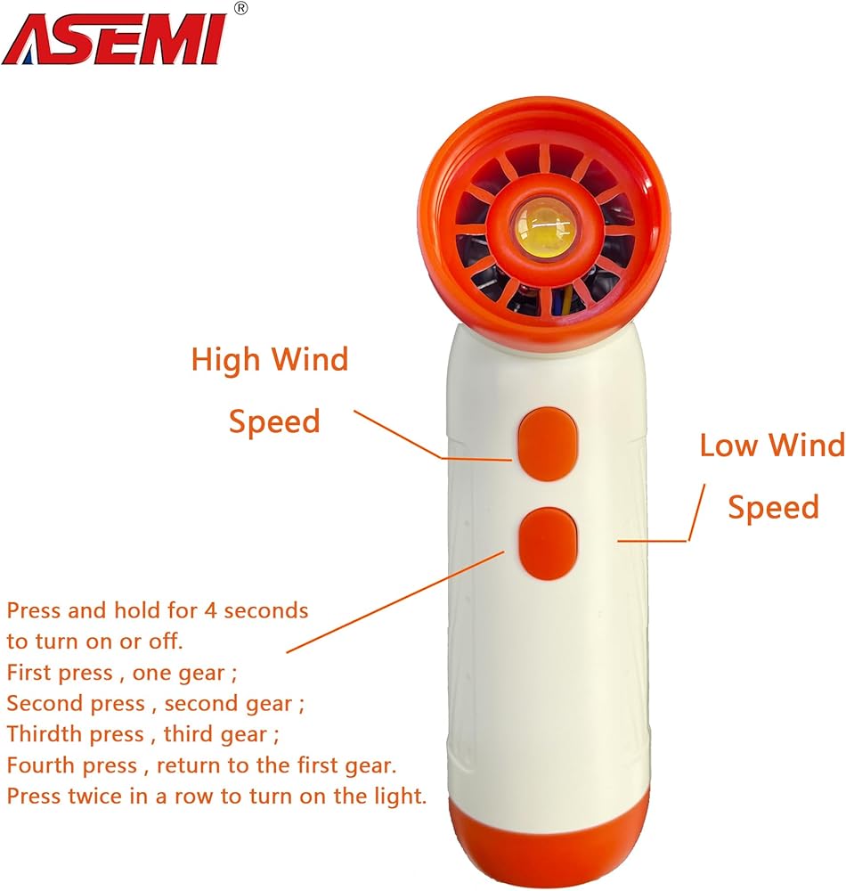 ※ 【Easy to operate】Double-button design, long press the top button to turn it on, release it to turn it off automatically, you can use it as long as you want; the bottom button is designed with dual functions, which can adjust the wind speed and turn on the LED light: long press for 4 seconds to turn on and off, each press adds one wind speed, a total of three gears. Double-click twice to turn on and off the light.