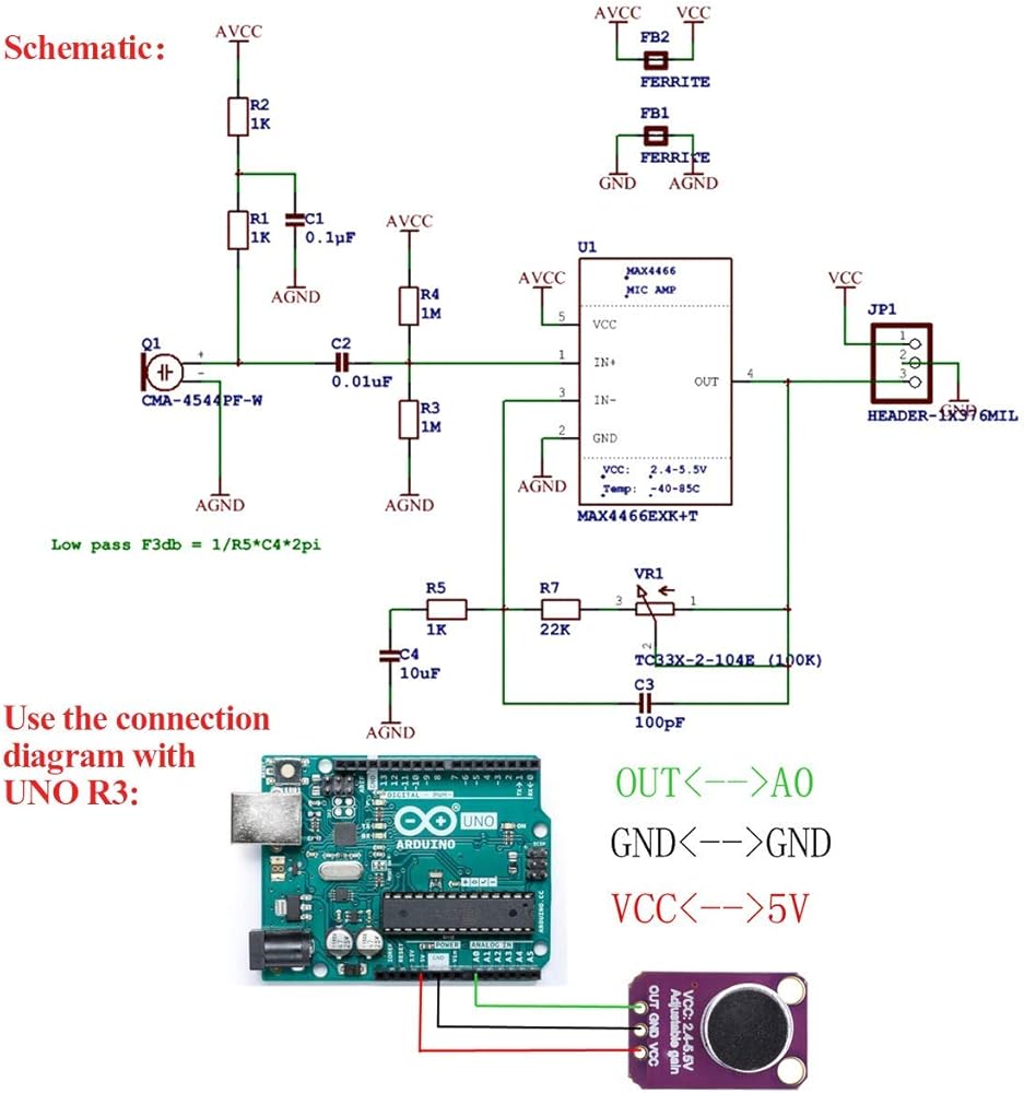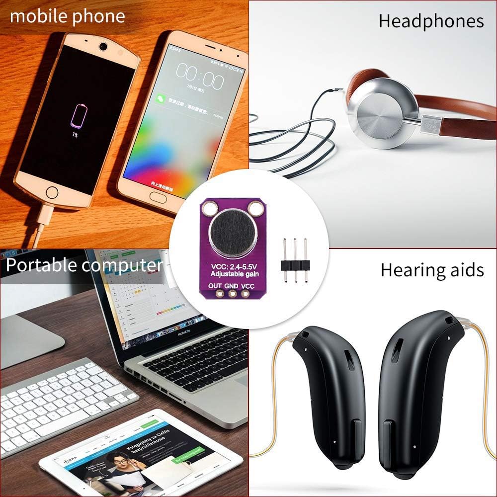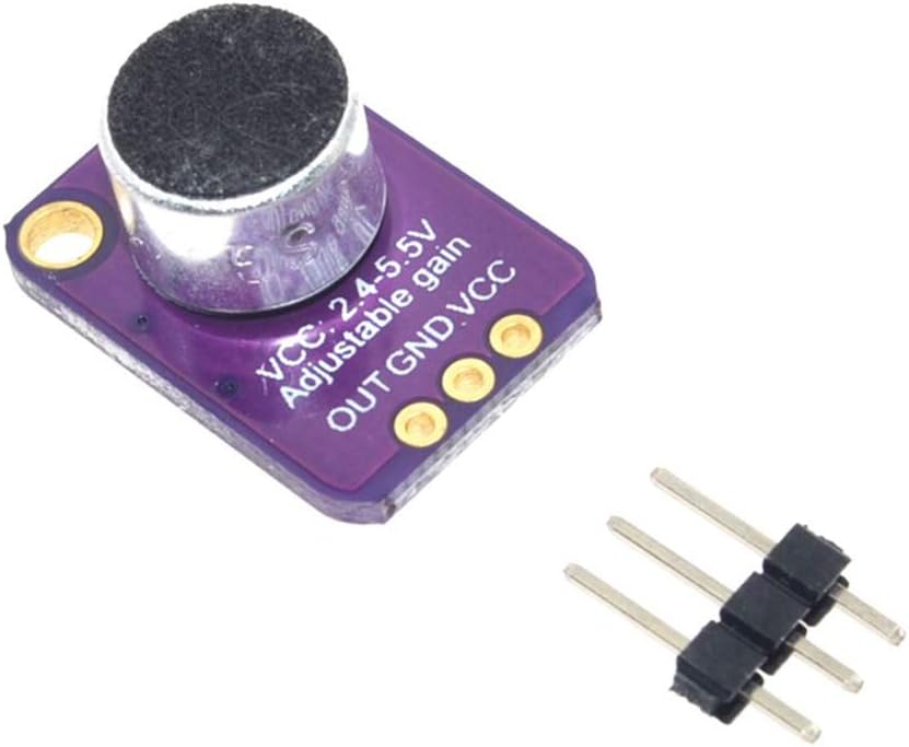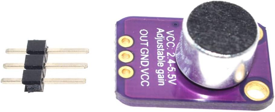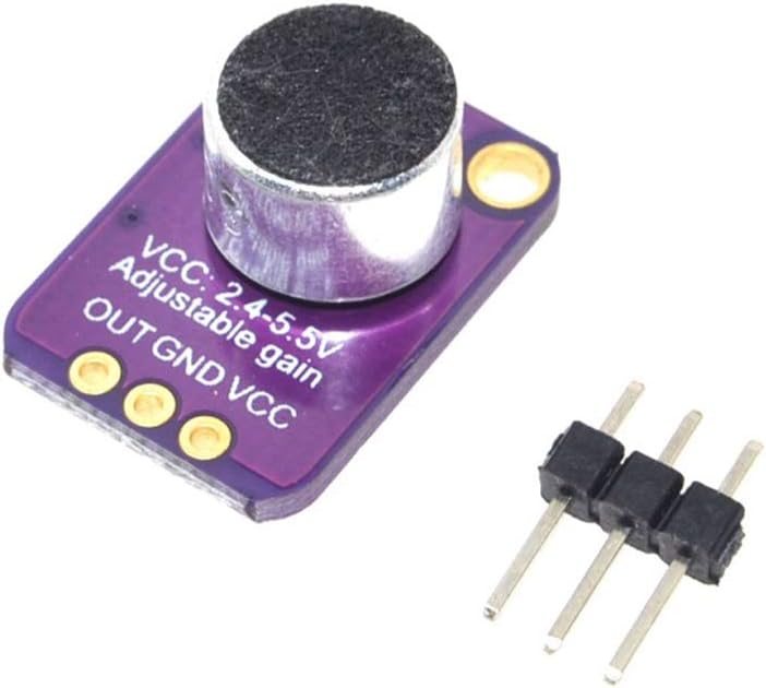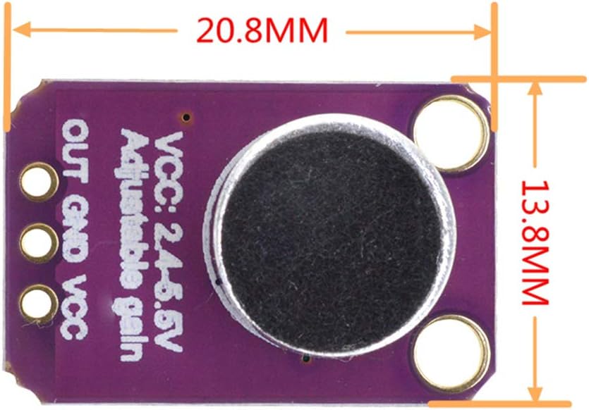 Description: The MAX4466 is a micro power operational amplifier optimized for use as a microphone preamplifier. Add an ear to your project with this well-designed which has excellent power supply noise rejection. On the back, we include a small trimmer pot to adjust the gain. You can set the gain from 25x to 125x. That's down to be about 200mVpp (for normal speaking volume about 6" away). Using introduction: Connect GND to ground, VCC to 2.4-5VDC. The audio waveform will come out of the OUT pin. The output will have a DC bias of VCC/2 so when it's perfectly quiet, the voltage will be a steady VCC/2 volts (it is DC coupled). If the audio equipment you're using requires AC coupled audio, place a 100uF capacitor between the output pin and the input of your device. If you're connecting to an audio amplifier that has differential inputs or includes decoupling capacitors, the 100uF cap is not required. Features and benefits: Power supply voltage: + 2.4V to + 5.5V (can be directly connected to STM / ARDUNIO / Raspberry Pi and other development board) Power supply rejection ratio: 112dB Common mode rejection ratio: 126dB AVOL: 125dB (RL = 100kΩ) rail-to-rail output Static supply current: andlt;24μA Gain bandwidth: 600kHz Size: 20.8mm x 13.8mm x 7.5mm/0.8 x 0.5 x 0.3inch Applications: Cellular phone Digital repeater Headphones Hearing aids Microphone preamplifier Portable computer Speech recognition system Package included: 5 x MAX4466 Electret Microphone Amplifier Module 5 x 3pin 1 x 15pin DuPont Wire Female to Male