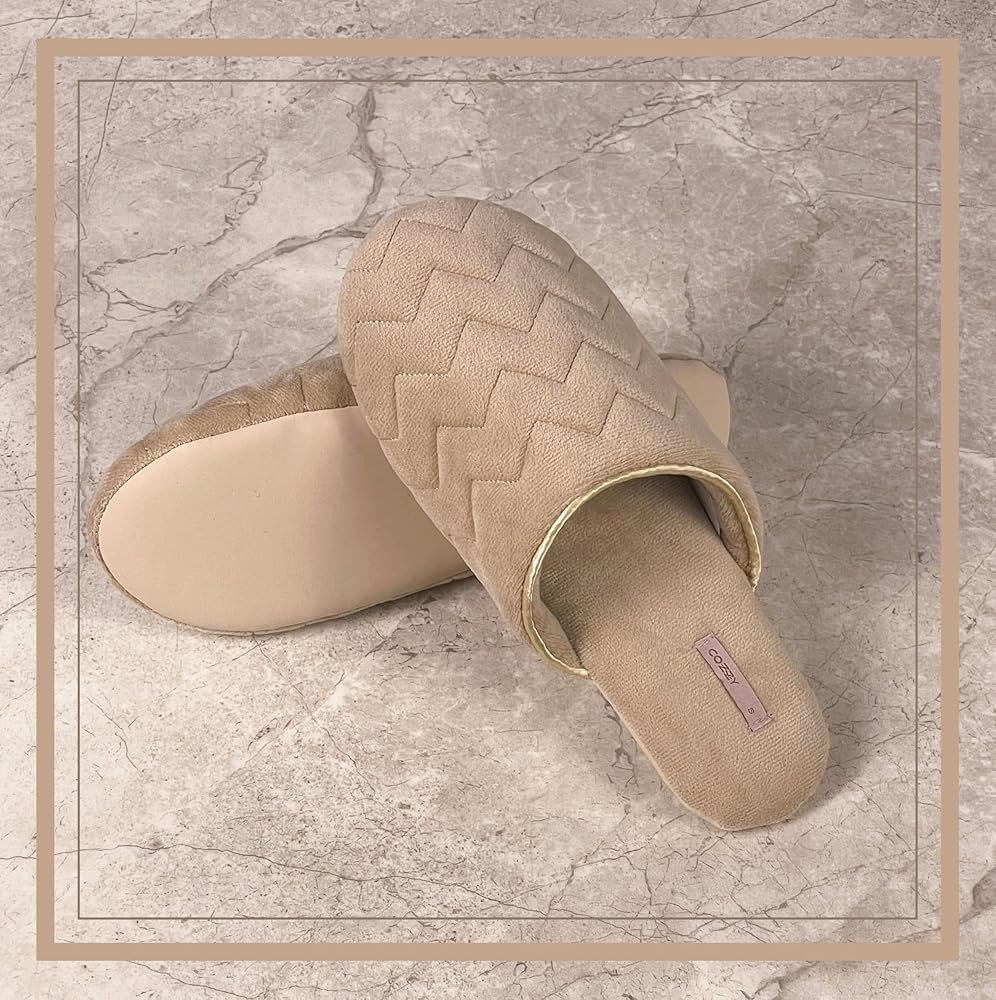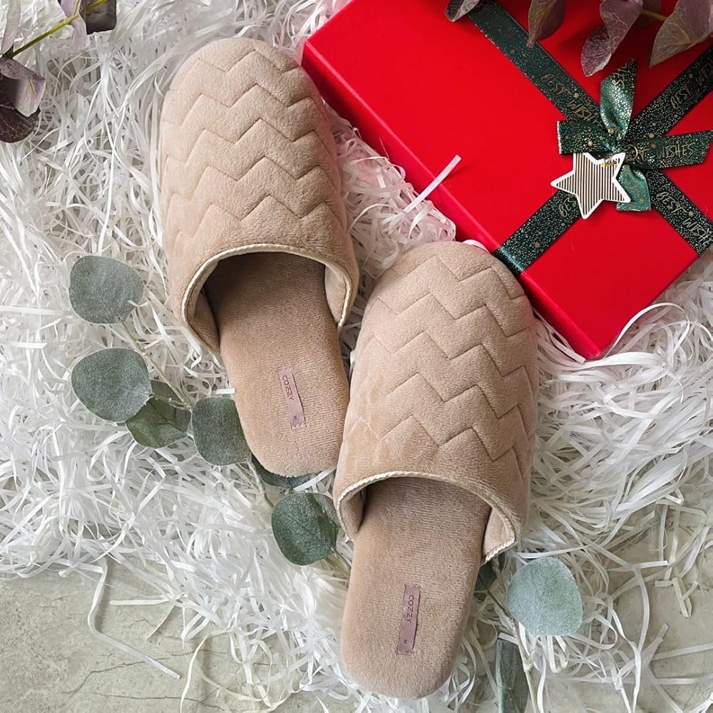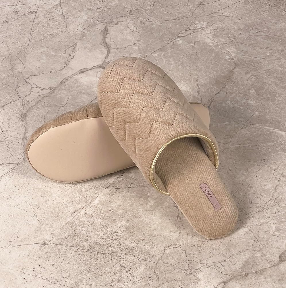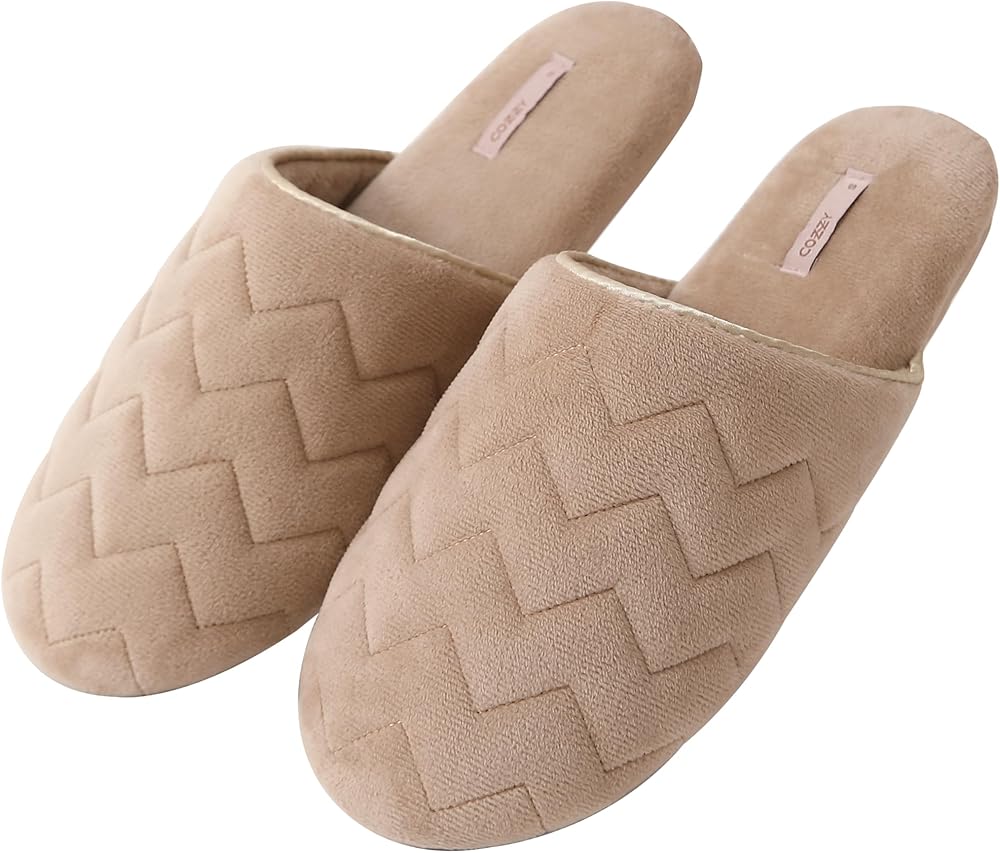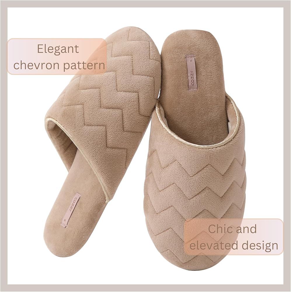 COZZY women’s slippers for home with soft memory foam in nude with chervon pattern, chic slip on everyday indoor slippers for women with lightweight smooth suede outsole