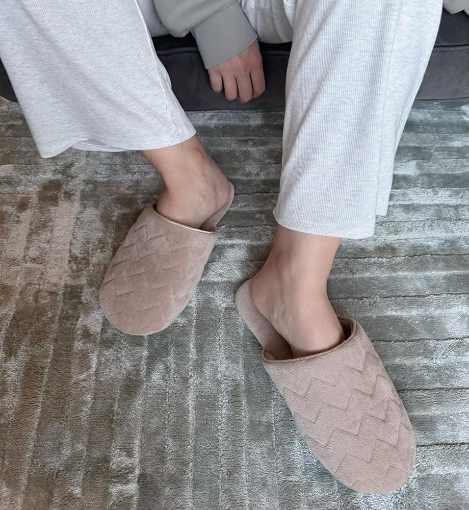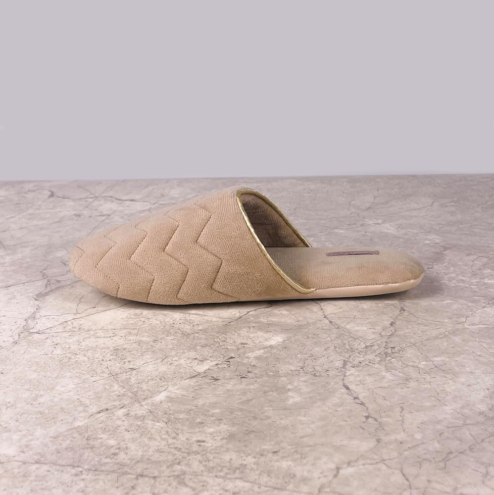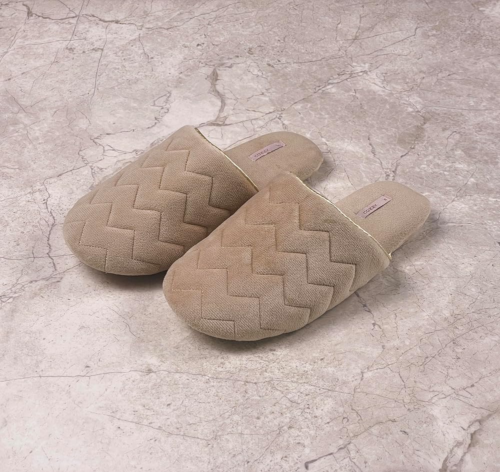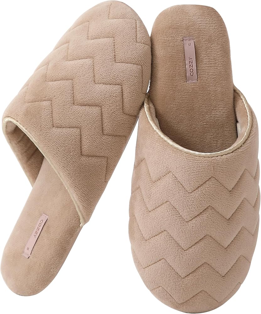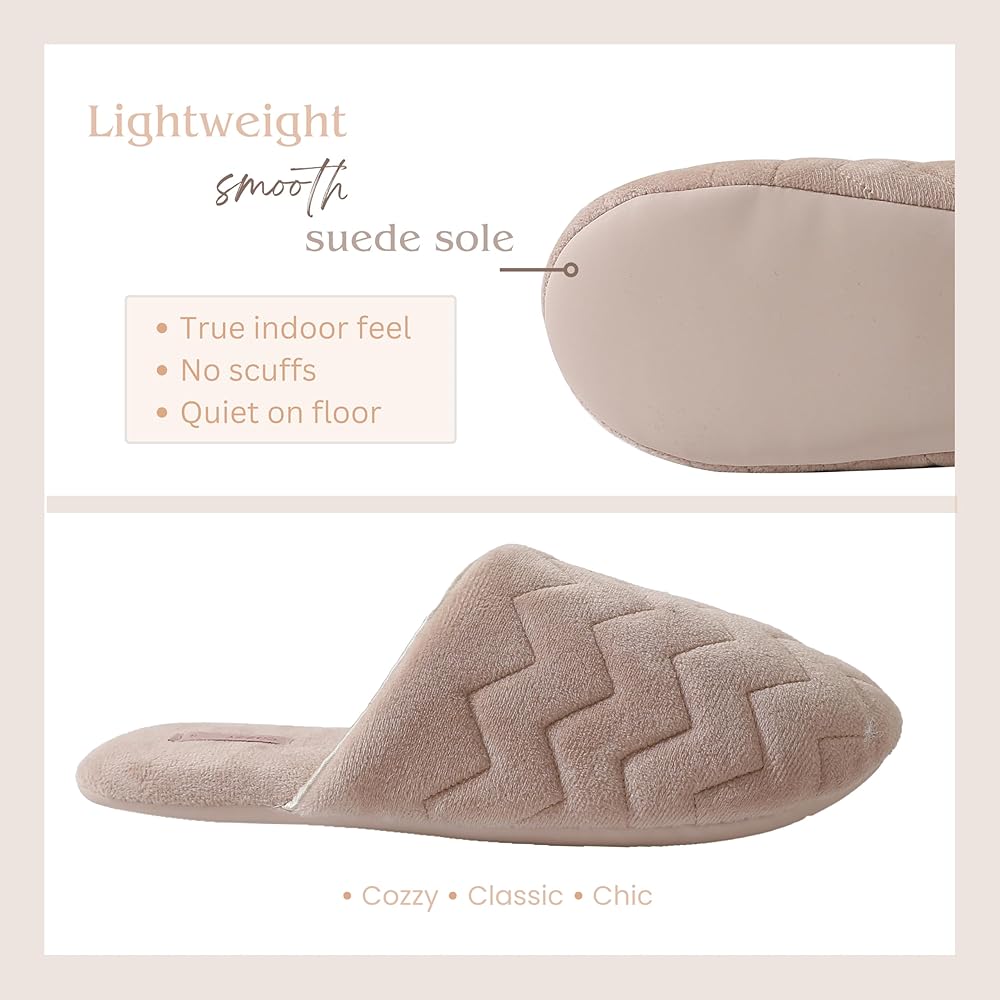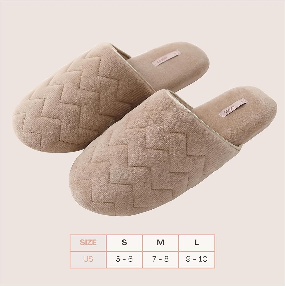 COZZY women’s slippers for home with soft memory foam in nude with chervon pattern, chic slip on everyday indoor slippers for women with lightweight smooth suede outsole