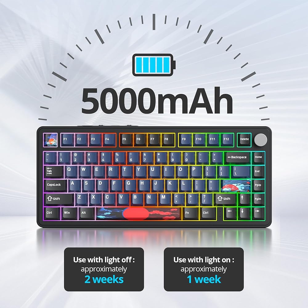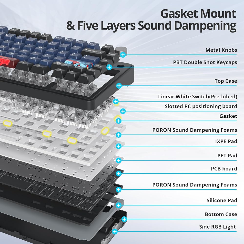 【Sound Dampening Design & Compact Gaming Layout】 with multi-layer sound dampening design keep your key presses quiet for focused gaming or coding sessions; A compact 75% layout; TKL size with number pad removed for an optimized layout in a smaller footprint,saves valuable desk space without sacrificing functionality, ideal for desktop use or travel