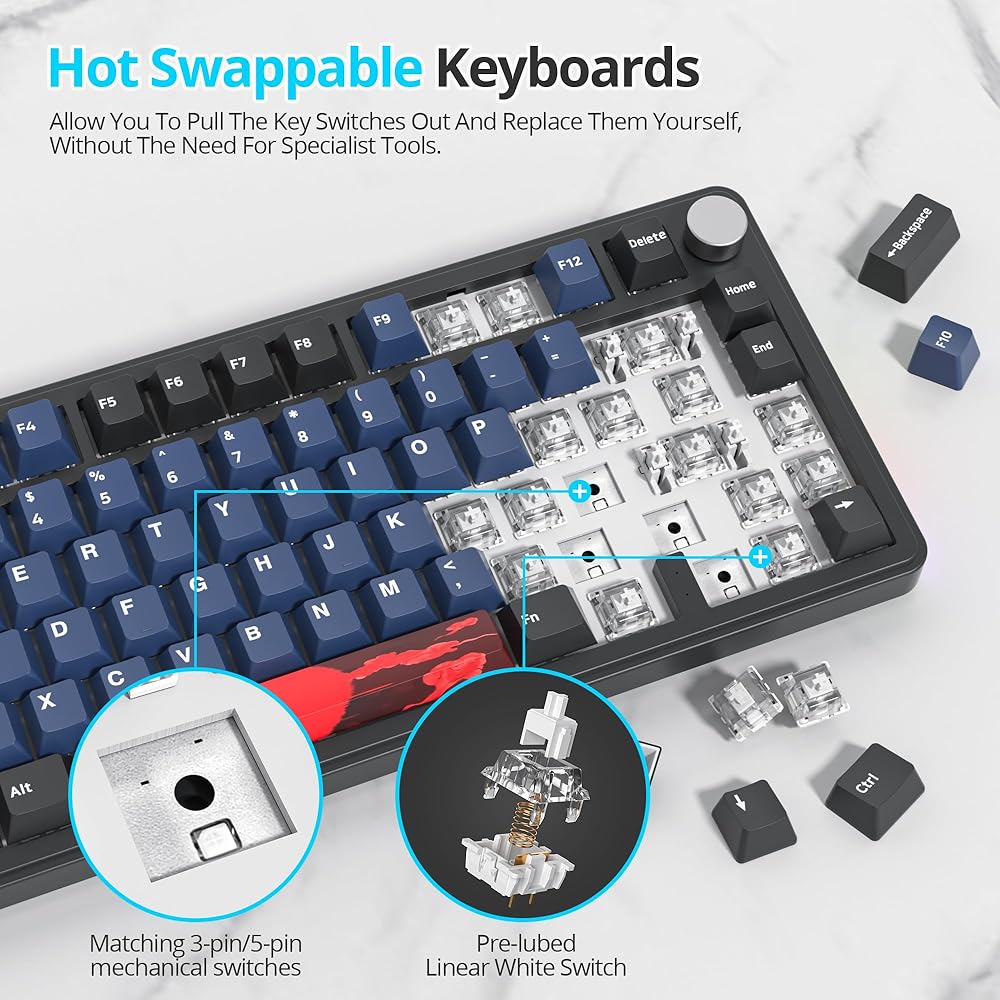 【Hot-Swappable Keys & Multifunction Knob】 Knob allows for quick volume and media control without disrupting your game. The keyboard backlight Mode and media (volume, play/pause) are all in control with no hassle; Offers premium hot-swappable sockets, easily replace individual switches without soldering to customize your feel and sound with other switches