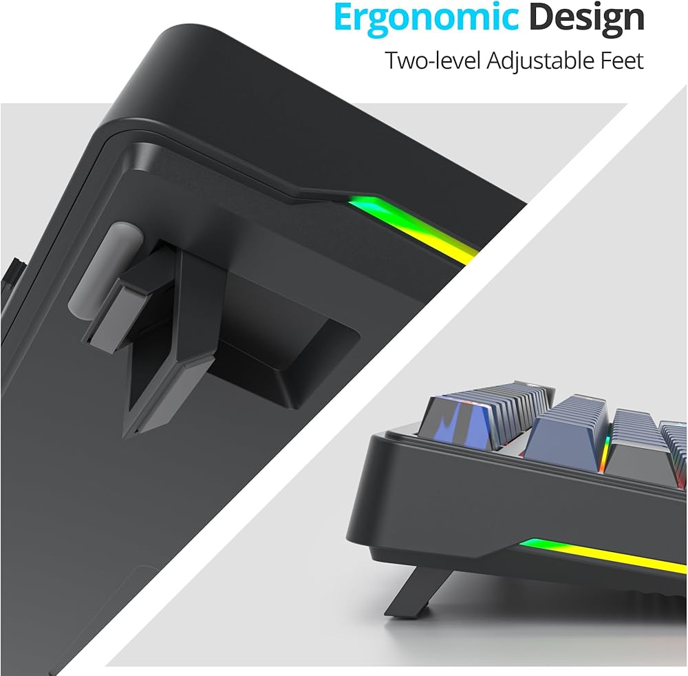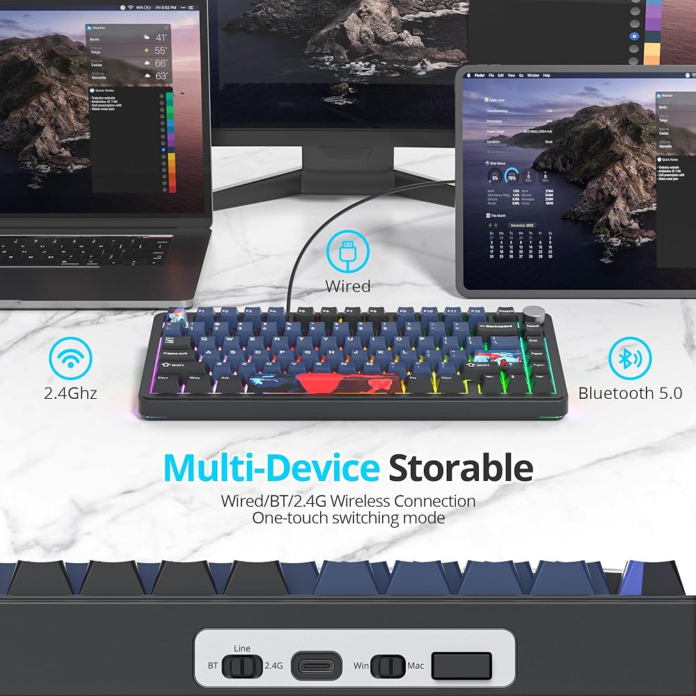 【3-Mode Connection】Geared with advanced tri-mode connection technology, USB-A wired, BT 3.0/5.0 & 2.4Ghz wireless modes.This compact gaming keyboard connects wirelessly via Bluetooth or USB receiver for untethered use on Win/Mac computers