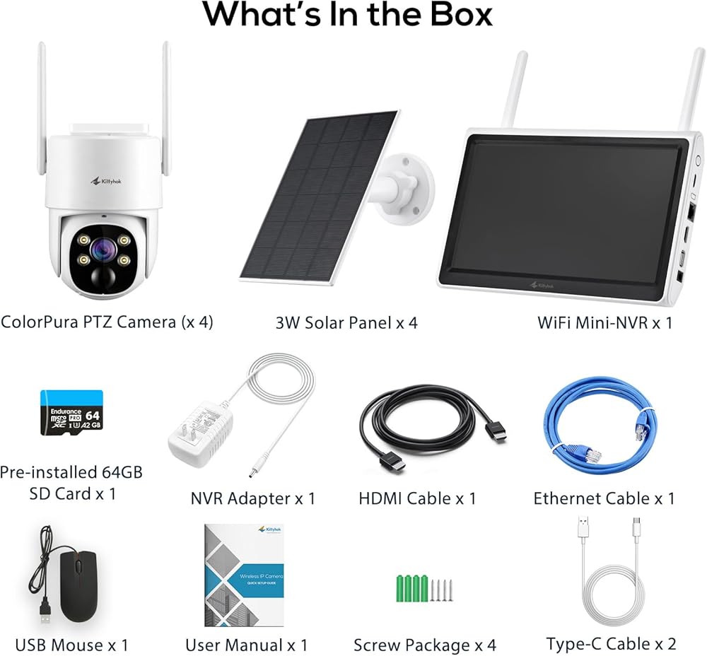 Kittyhok Outdoor Solar Security Camera System Wireless | 4pcs 2K Solar PTZ Security Camera, Pro Color Night Vision, Human Detection, 360 Viewing | 10CH NVR with 10'' HD Monitor, 60 Days Local Storage