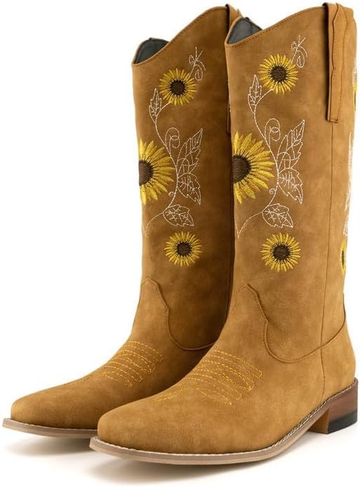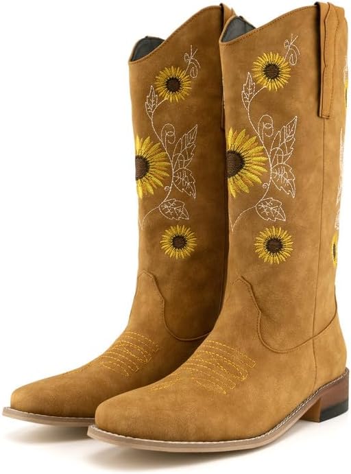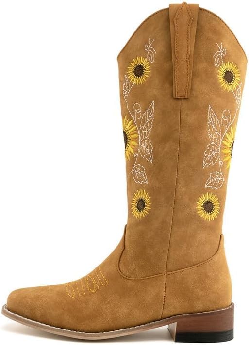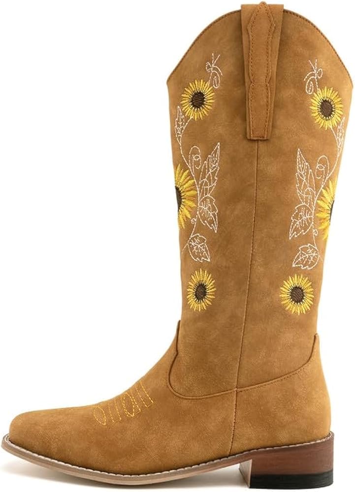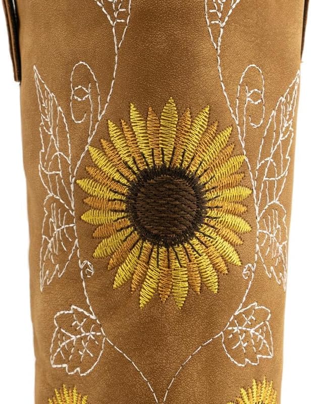Embroidery: Meticulously adorned shaft of mid-calf cowgirl boots features intricate sunflower embroidery, adding vibrant flair.