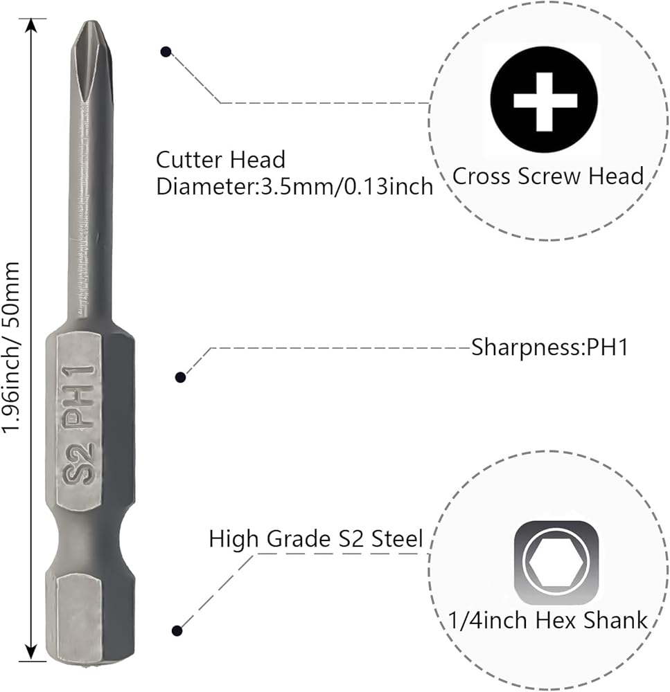 Head Size:Type of head: PH00 cross phillips screw head, Type of Shank: 1/4"inch hex shank, Overall Length: 1.96inch/ 50mm;
