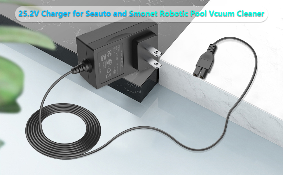 【Products Specification】Input: 100-240V AC, 50-60Hz; Output: 25.2V . Fit for Seauto Crab CA CR and Smonet CR6 cordless pool vacuum cleaner .