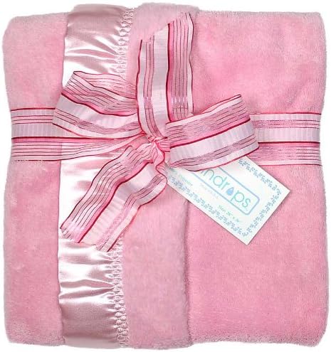 This is Raindrops ultimate super soft, Flurr Receiving Blanket. You've got to feel it to believe it. This pink blanket features a 2" satin binding all around the edges that is attached with a custom embroidered trim. It measures a generous 28" by 36". Our top quality flurr is warm, soft to the touch and machine washes and drys beautifully. This luxurious blanket will be treasured by every baby who receives it. It makes a beautiful baby gift on its own or can be added to almost any other items, for an amazing presentation. It can be used not only to cover baby up but can also be used in a bed or car seat or even on the floor for baby to lay on. Check out the included gift packaging with matching wired ribbon. This pink blanket is for a girl, but it also comes in white, blue and sage green. Raindrops has been manufacturing top quality, unique baby garments in the USA, since 1936.