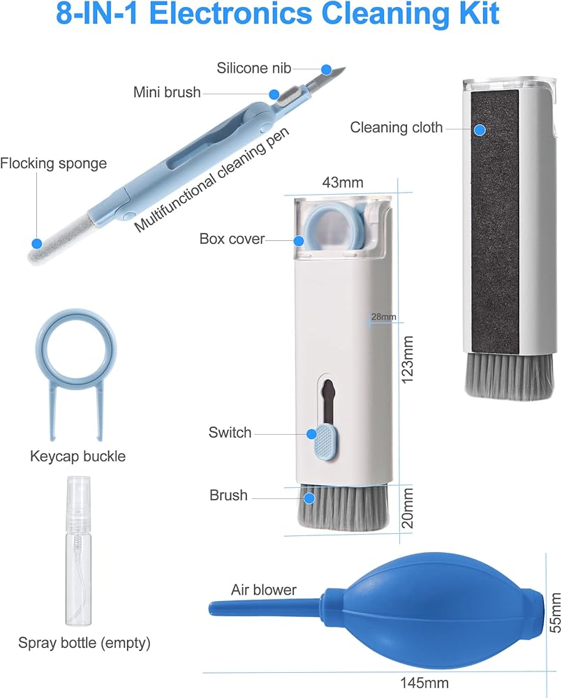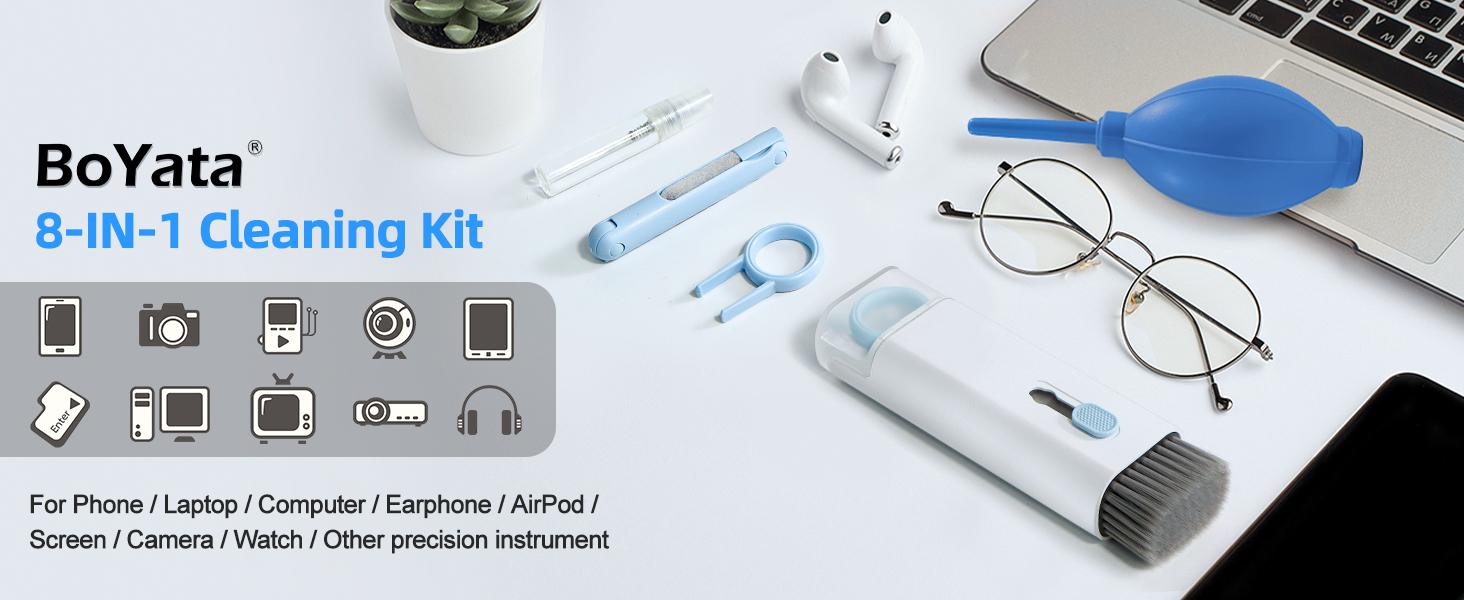 ✨Package List: BoYata multifunction 8-in-1 electronic cleaning kit includes 1 large high-density brush, 1 earphone cleaning pen, 1 keycap buckle, 1 spray bottle (NO LIQUID), 1 air blower, and 1 cleaning cloth (the back of the brush). Complete accessories to meet different cleaning needs, and improve the quality of life and work.
