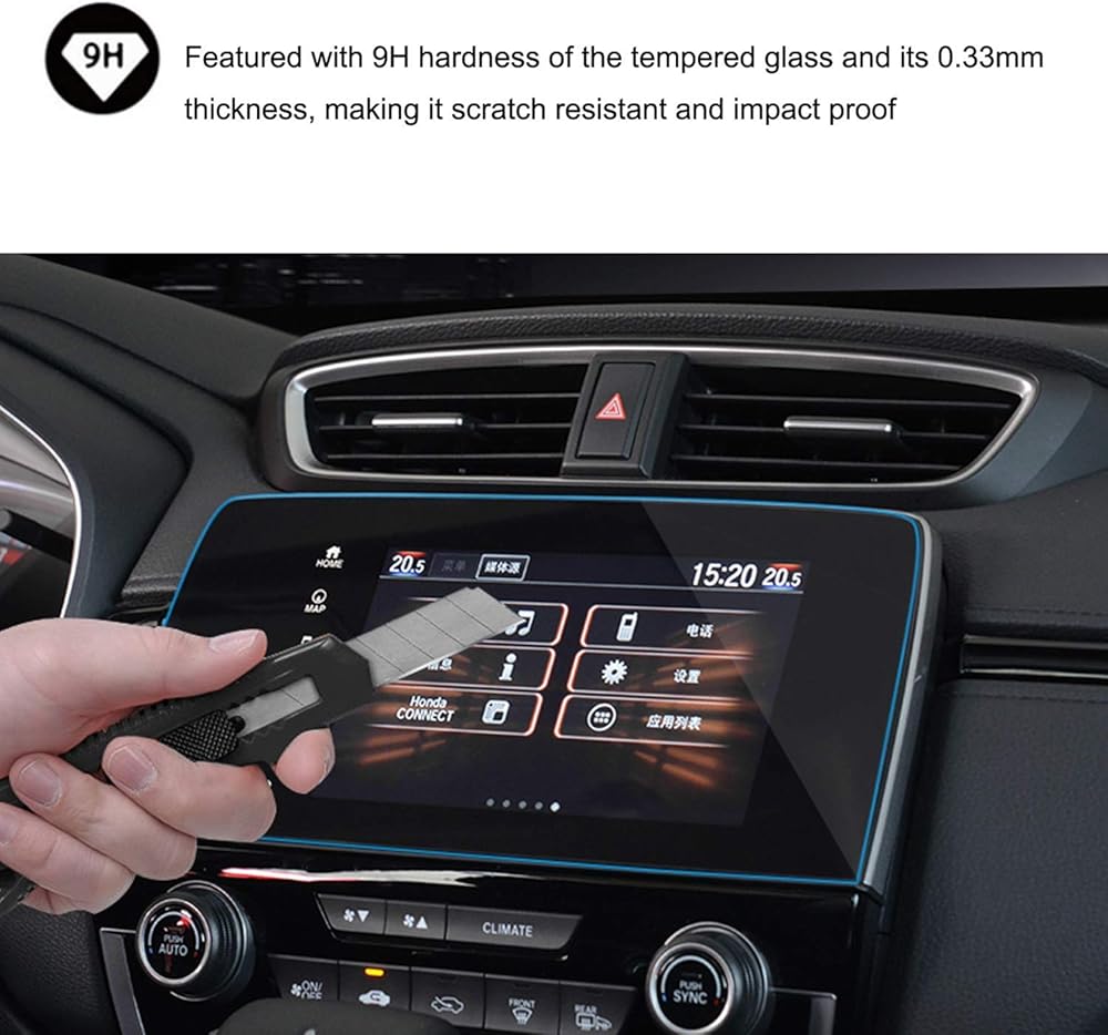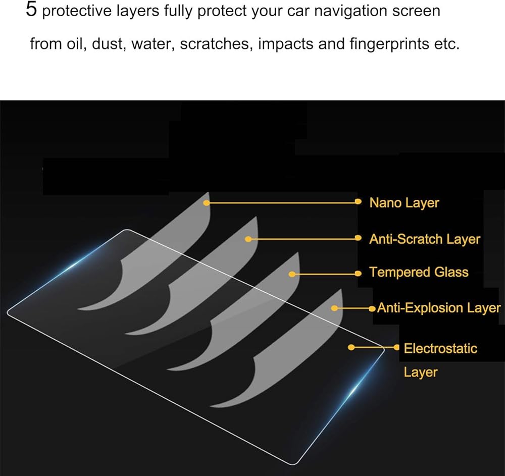 [5 Protective Layers] Made of high quality tempered glass screen protector materials with 5 protective layers -- Nano layer, Abrasion & Scratch resistant layer, Tempered glass layer, Anti-explosion layer and Electrostatic absorption layer, fully protecting your car navigation screen from dust, water, oil, scratches and fingerprints etc.