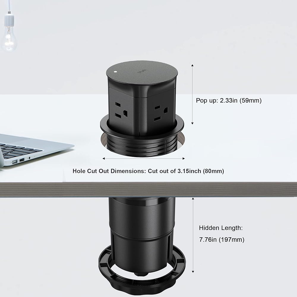Easy Installation: The Jgstkcity pop-up outlet is designed for seamless integration into any workspace, requiring only a 3.15-inch hole size for mounting. Its spring-loaded mechanism allows for effortless pop-up action, making it an ideal addition to your countertop or kitchen countertop. Embrace the convenience of a hidden power tower with USB ports, transforming any space into a clutter-free charging station.