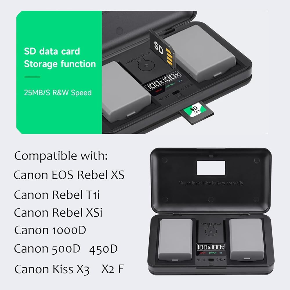 LP-E5 Battery Charger: (1)could as a camera storage case to store 2 batteries, (2)and is 2 SD card storage case. (3)Can be used as a card reader to read camera memory card information.
