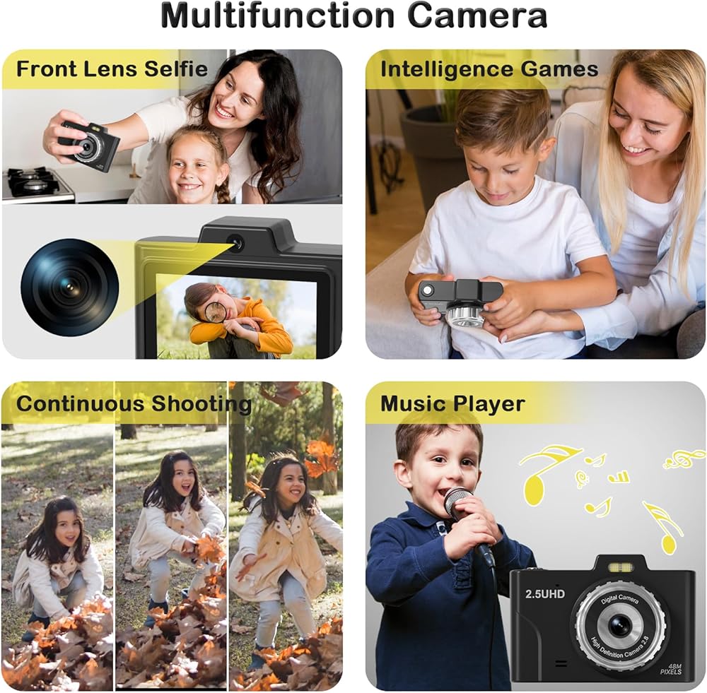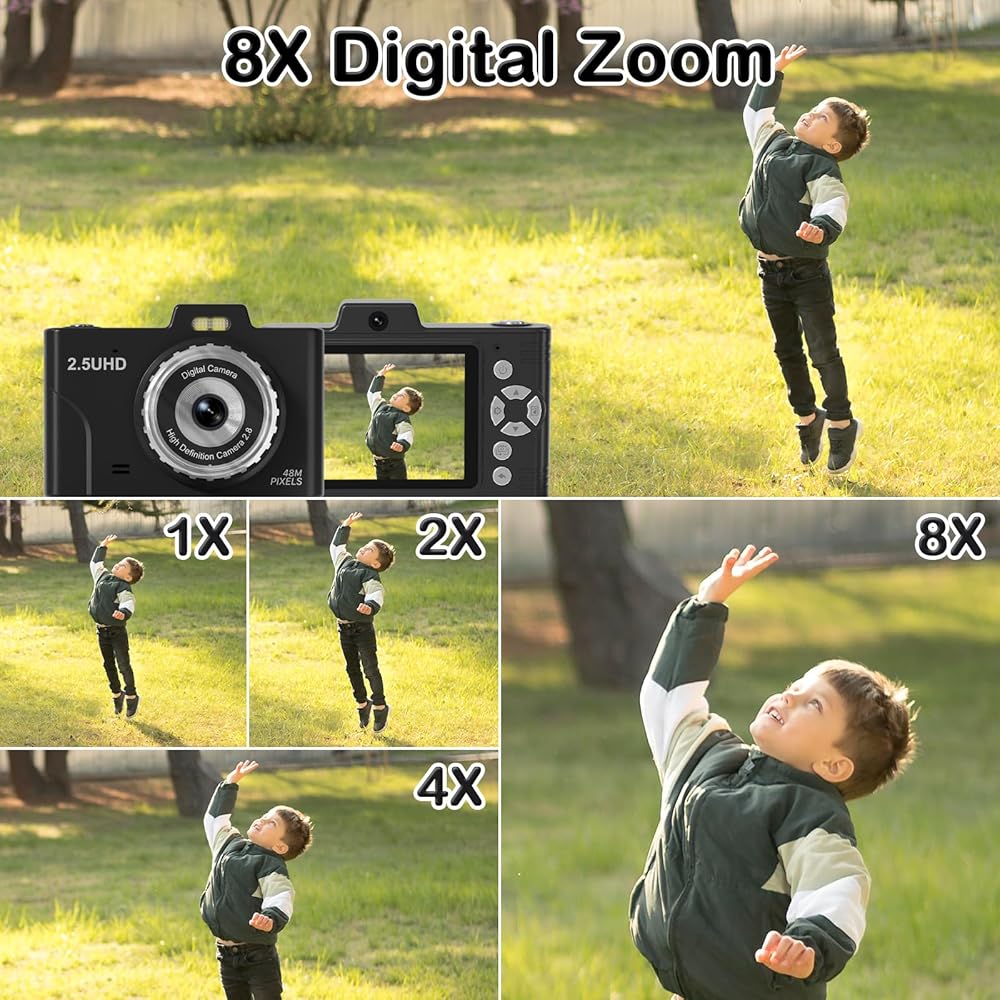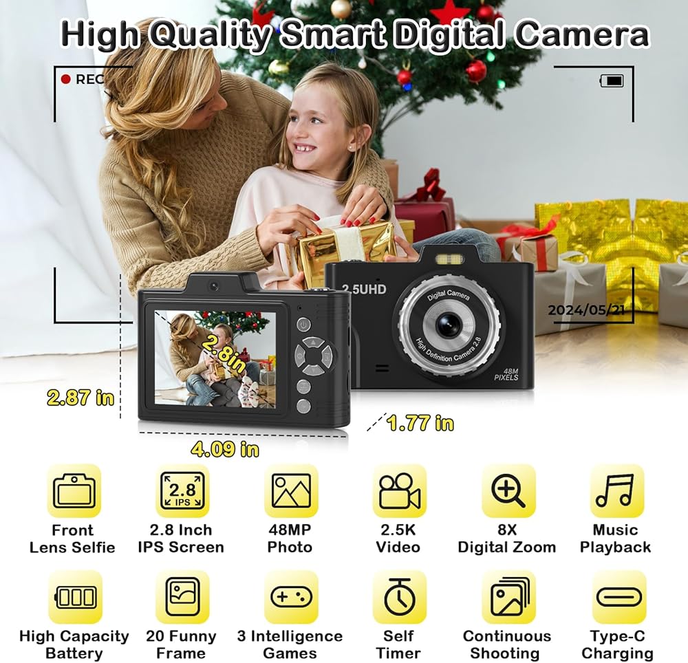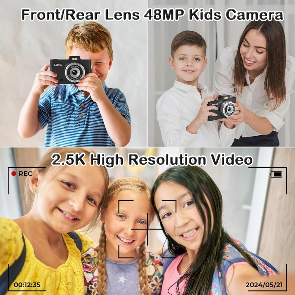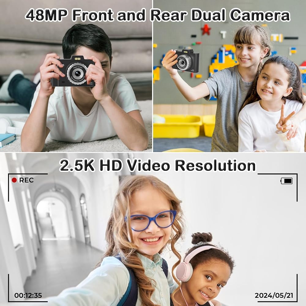 📸【𝐅𝐇𝐃 𝟐.𝟓𝐊 𝟒𝟖𝐌 & 𝐄𝐚𝐬𝐲 𝐎𝐩𝐞𝐫𝐚𝐭𝐢𝐨𝐧】This point and shoot digital camera features a 48MP front and rear dual lens and records FHD 2.5K videos, making it easy for kids to capture high-resolution photos, detailed selfies, and fun videos. Unlike other kids' cameras, ours significantly enhances clarity, beautifully capturing special moments. Designed for kids, teens, and beginners, this small camera requires no complex setup. You might be surprised you have quite the talented little photographers.