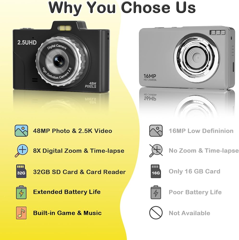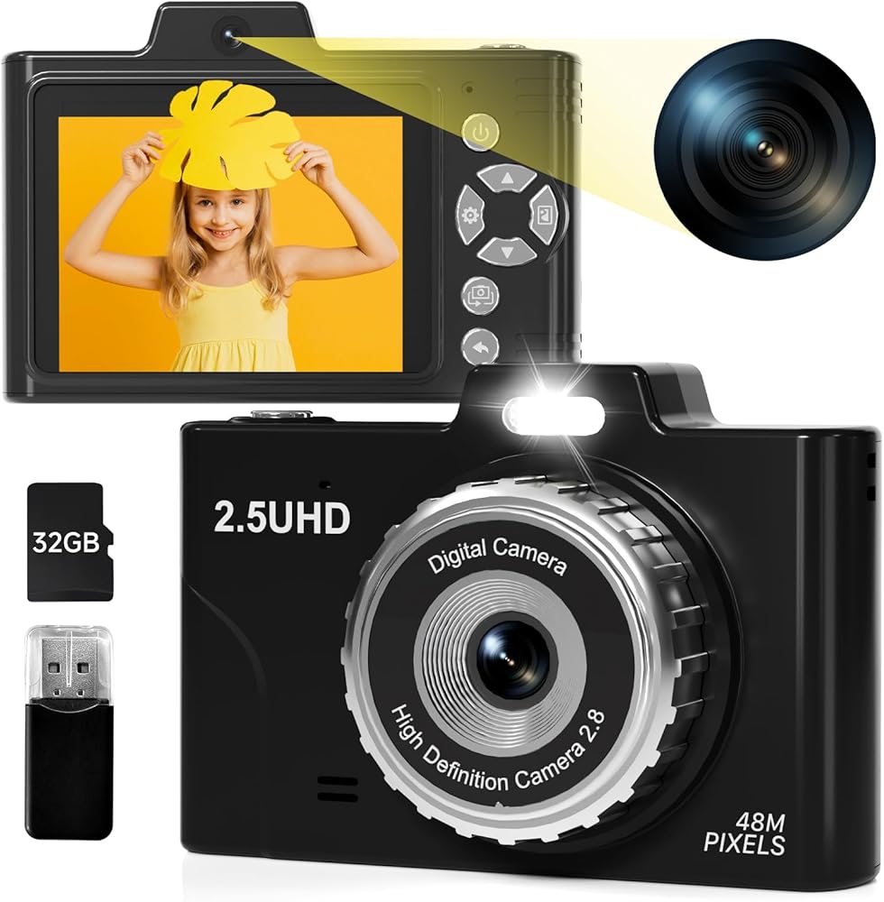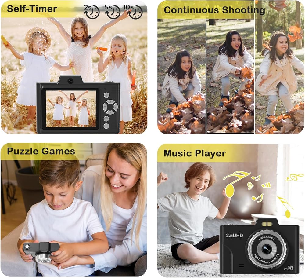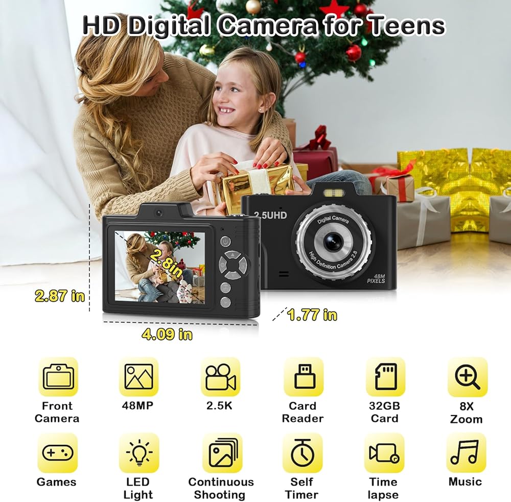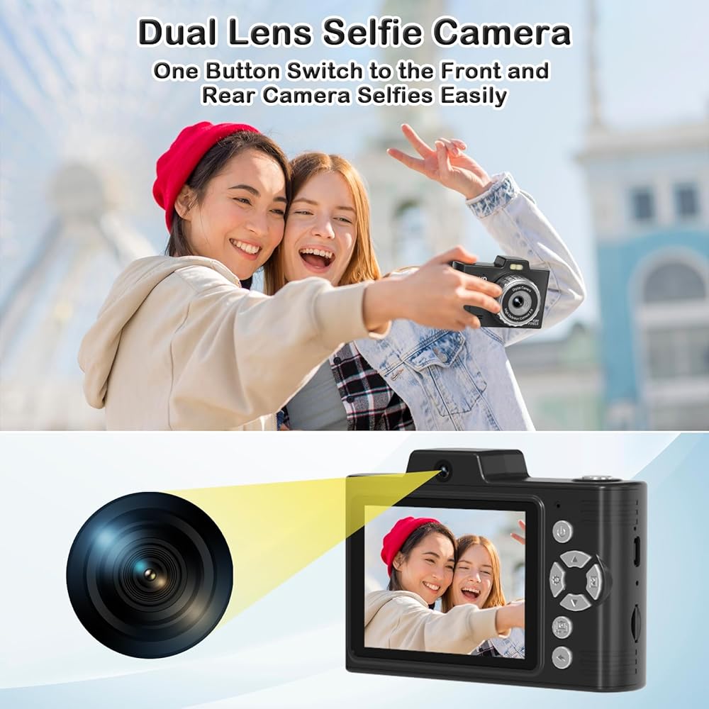 📸【𝐅𝐇𝐃 𝟐.𝟓𝐊 𝟒𝟖𝐌 & 𝐄𝐚𝐬𝐲 𝐎𝐩𝐞𝐫𝐚𝐭𝐢𝐨𝐧】This point and shoot digital camera features a 48MP front and rear dual lens and records FHD 2.5K videos, making it easy for kids to capture high-resolution photos, detailed selfies, and fun videos. Unlike other kids' cameras, ours significantly enhances clarity, beautifully capturing special moments. Designed for kids, teens, and beginners, this small camera requires no complex setup. You might be surprised you have quite the talented little photographers.