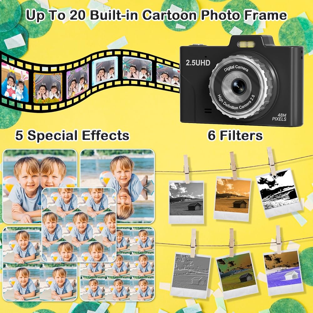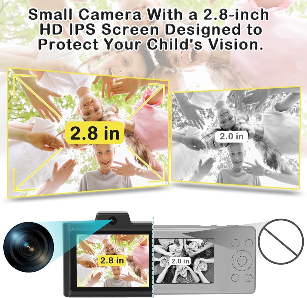 🎨【𝐌𝐮𝐥𝐭𝐢𝐩𝐥𝐞 𝐅𝐮𝐧𝐜𝐭𝐢𝐨𝐧𝐬 & 𝐏𝐫𝐚𝐜𝐭𝐢𝐜𝐚𝐥 𝐅𝐮𝐧】This toy camera comes with 20 cartoon sticker photo frames and 6 filters to spark kids' creativity, allowing them to experiment with different effects for fun and unique photos. It features a 2.8-inch HD IPS eye protection screen, supports flash for night shots, and offers 8X digital zoom, selfies, video recording, 3 burst, Time Lapse, music, and 3 puzzle games. It's a fantastic choice for a teens first vlogging camara to capture life's special moments.