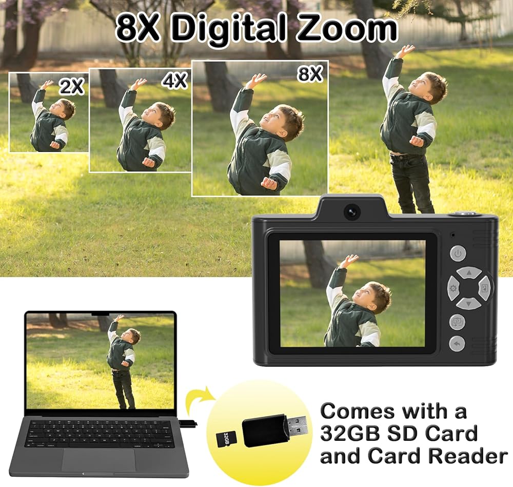 💾【𝟑𝟐𝐆𝐁 𝐓𝐅 𝐂𝐚𝐫𝐝 & 𝐂𝐚𝐫𝐝 𝐑𝐞𝐚𝐝𝐞𝐫】This children's camera includes a 32GB card and card reader, providing plenty of storage for precious memories. Use the included Type-C cable for quick picture and video downloads to your computer, or utilize the card reader to transfer media to your phone for easy social media sharing. With this portable digital camera, it can help reduce teens' and kids' electronic product addiction while capturing life's joyful moments.