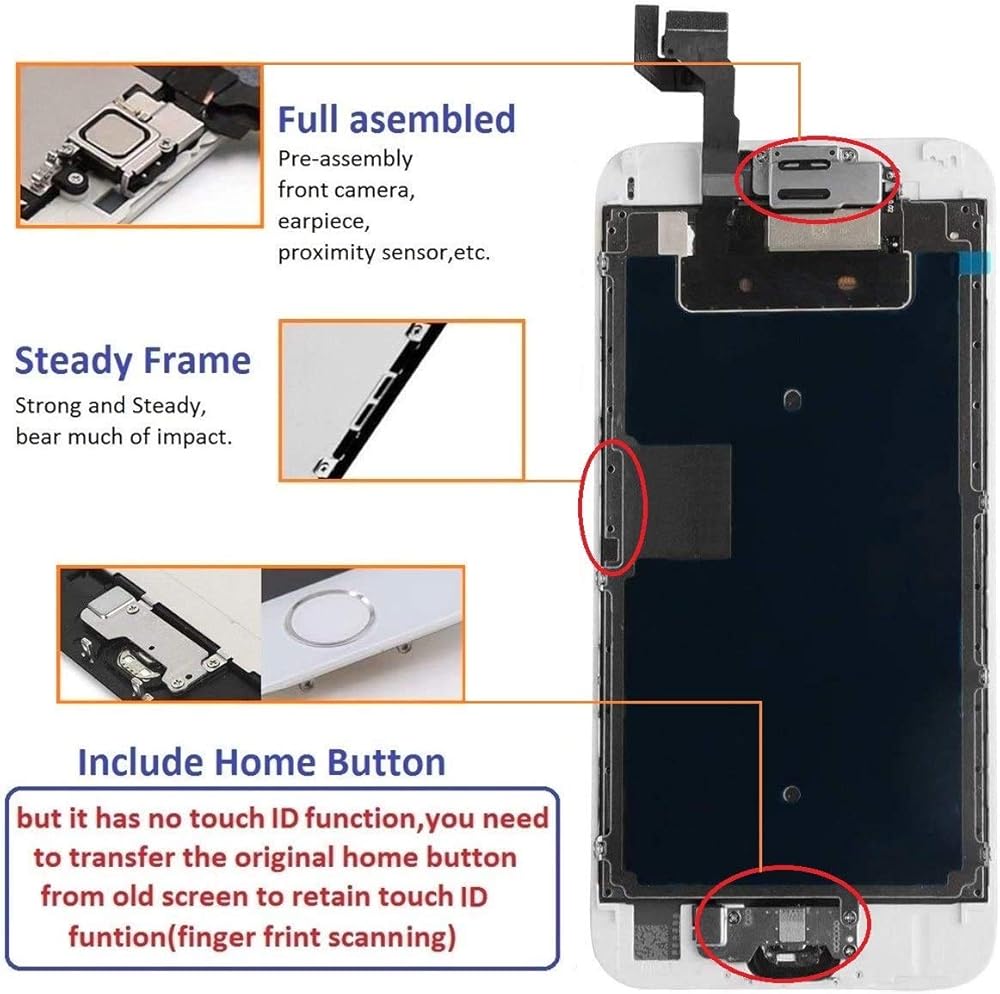 【Easy To Install】: This iPhone 6s replacement screen full assembly is pre-assembled with the home button, earpiece speaker, front camera, proximity sensor, metal backplate.