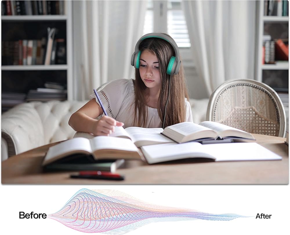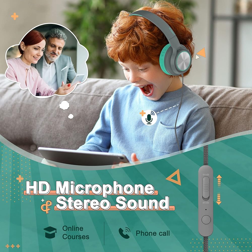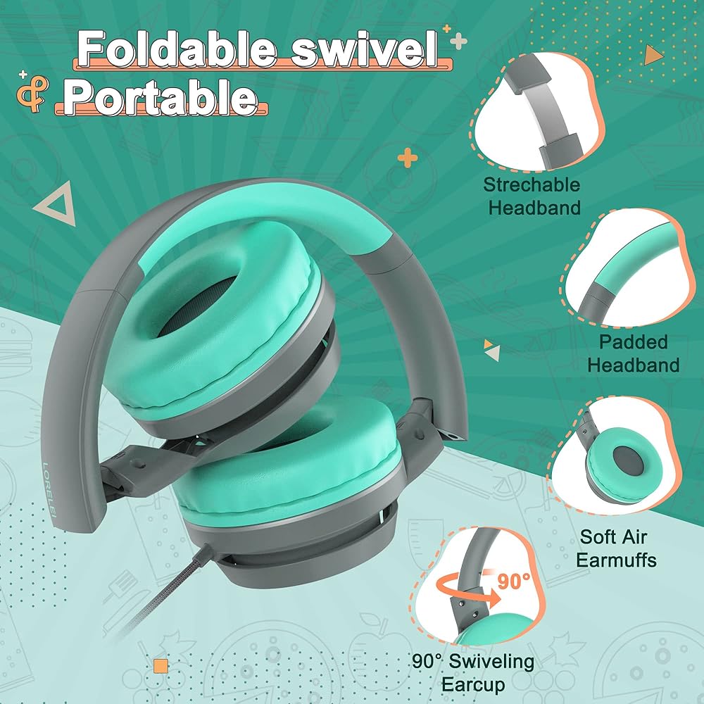 LORELEI E7 Kids Headphones with Microphone,On-Ear Wired Headset for Children/Boys/Girls,85/94dB Safe Volume,Foldable&Rotatable3.5mm Tangle-Free for School/iPad/Laptop/Travel (Grey&Green)