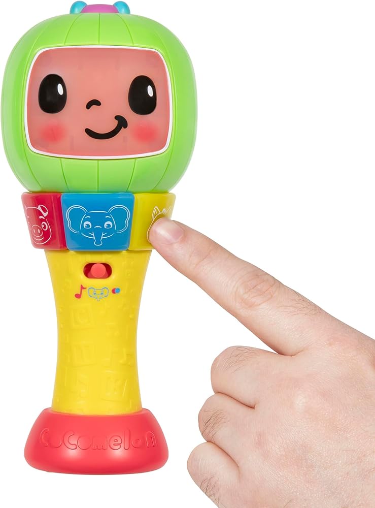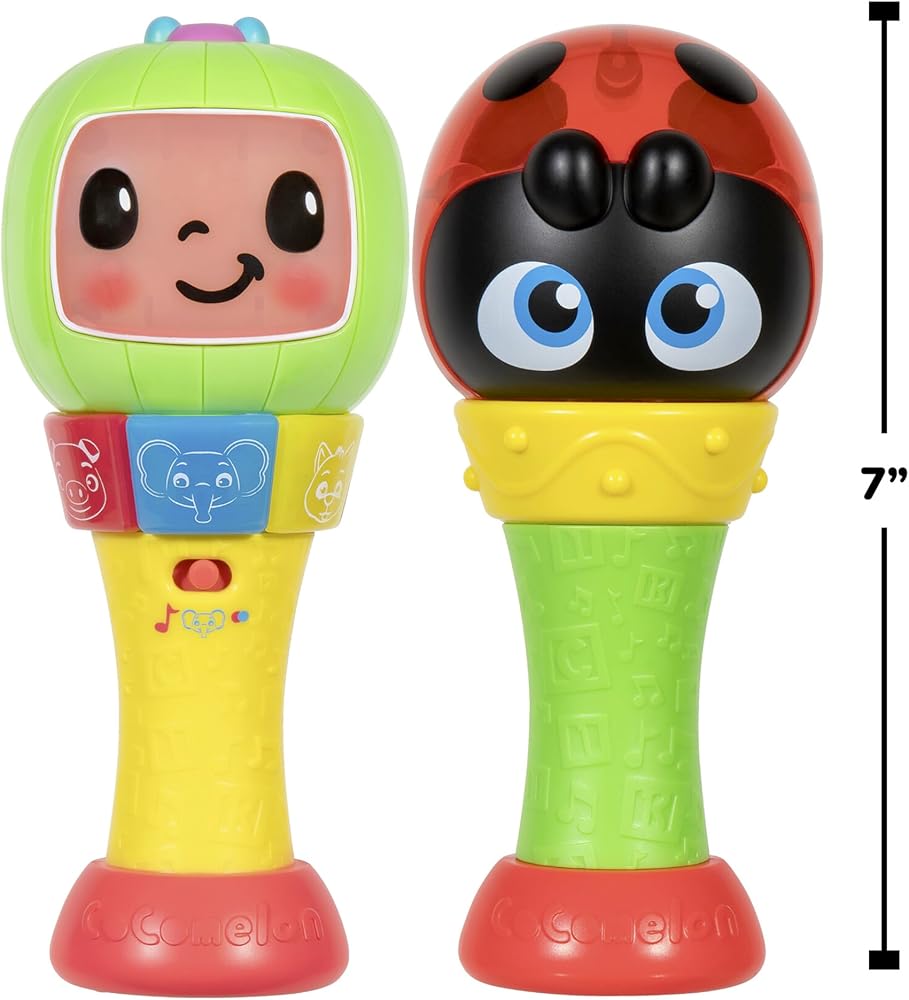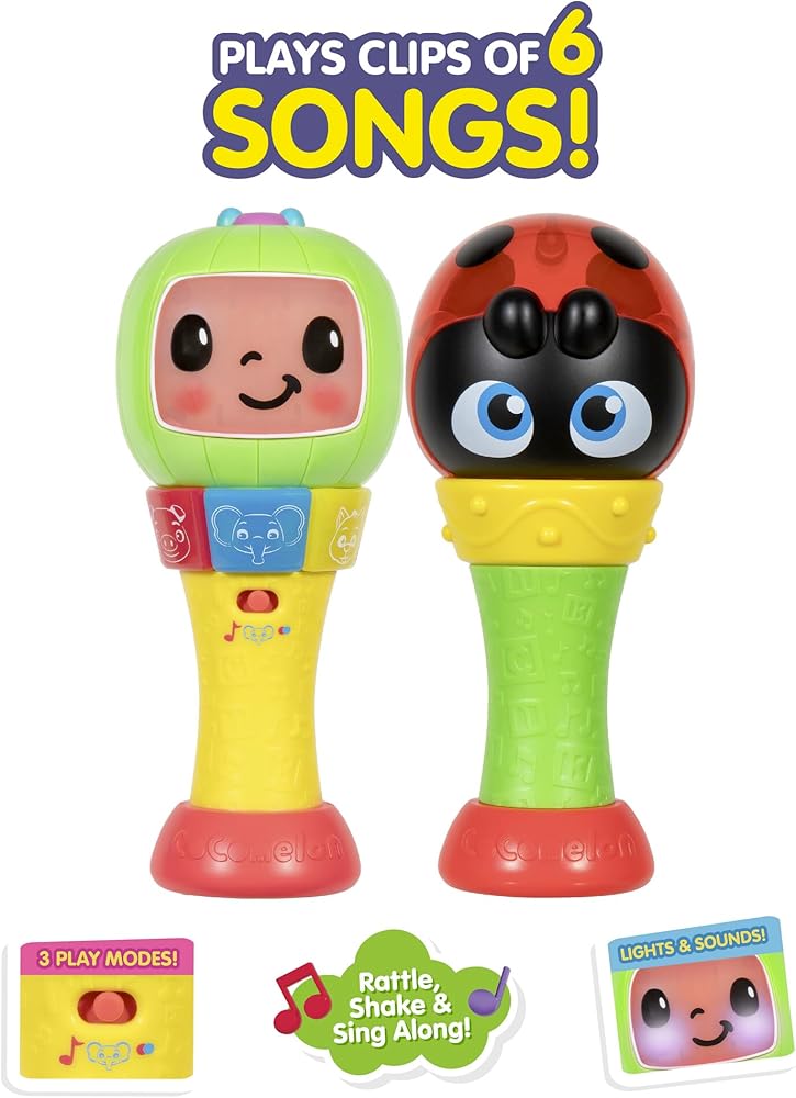 The CoComelon Sing ‘n Play Maracas are the perfect toy for little music makers. Inspired by the popular and educational series, CoComelon, the Sing ‘n Play Maracas will have your little ones moving and shaking as they sing along to CoComelon's hit songs! Interact with three play modes, hear clips of six fan-favorite songs, identify animal sounds, and learn colors. These bright and colorful rattle toy maracas will get your little one shaking and rocking to the beat in no time! CoComelon Sing ‘n Play Maracas are the perfect size for little hands to easily grasp, shake, and rattle. Bring home the CoComelon fun with plush, vehicles, instruments, figures, and more!