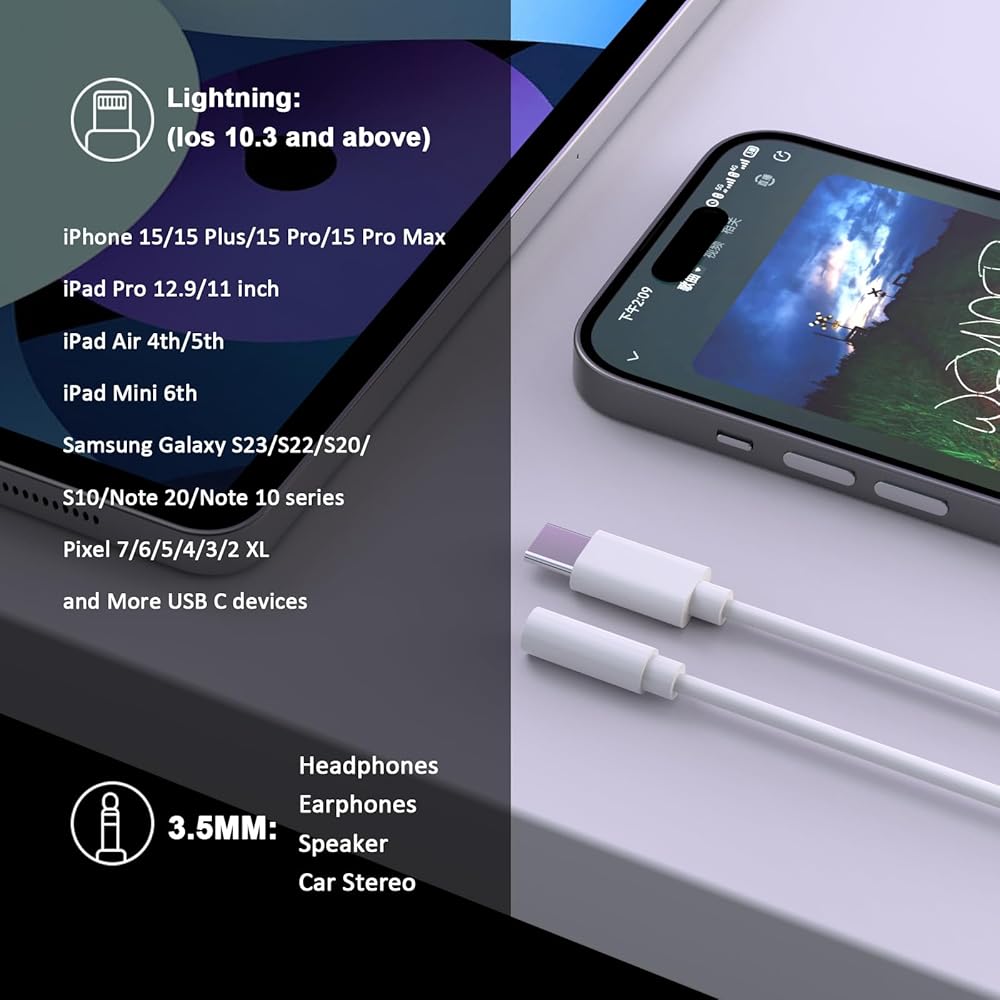 • 【Universal Compatibility】The iPhone 15 adapter for headphones is extremely versatile and supports a wide range of devices, including the latest iPhone 15/15 Plus/15 Pro/15 Pro Max, Galaxy S24/S24+/S24 Ultra/S23/S22/S21, Pixel 8/8 Pro/7/7 Pro/6/5, iPad Pro/Air/Mini, and more USB C devices.