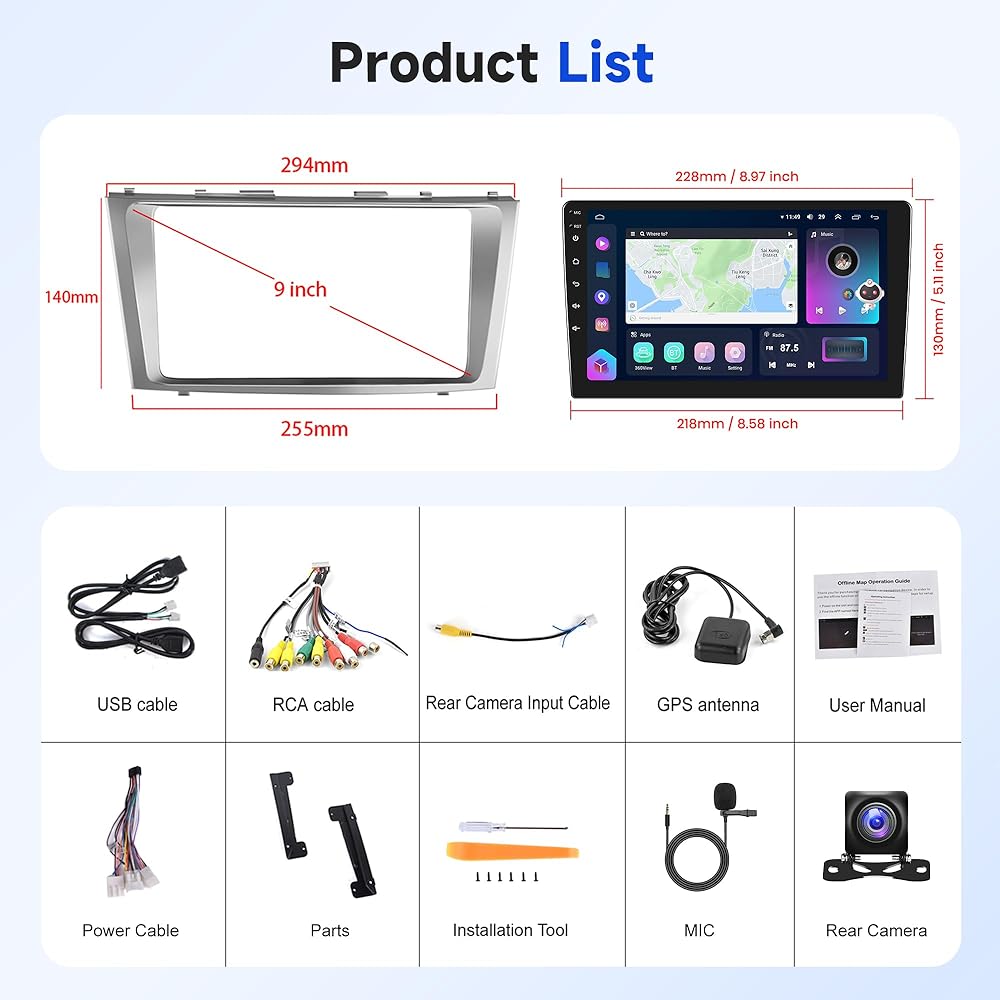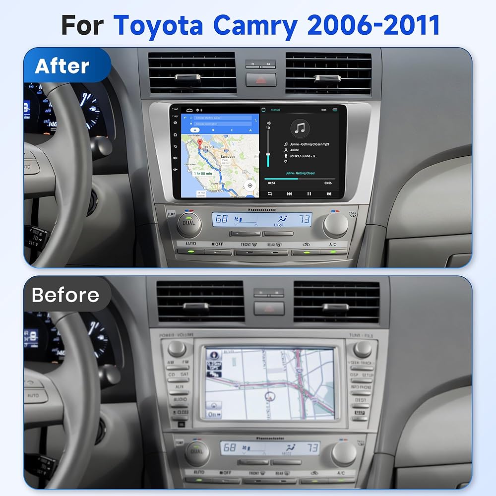 【Android Car Stereo for Toyota Camry 2006-2011】This car stereo is perfectly suitable for Toyota Camry 2006 2007 2008 2009 2010 2011, there's no need to purchase additional accessories. The design and contour of dash kit matched perfectly well with factory dashboard which is made of high-grade ABS Plastic Structure and of high quality.