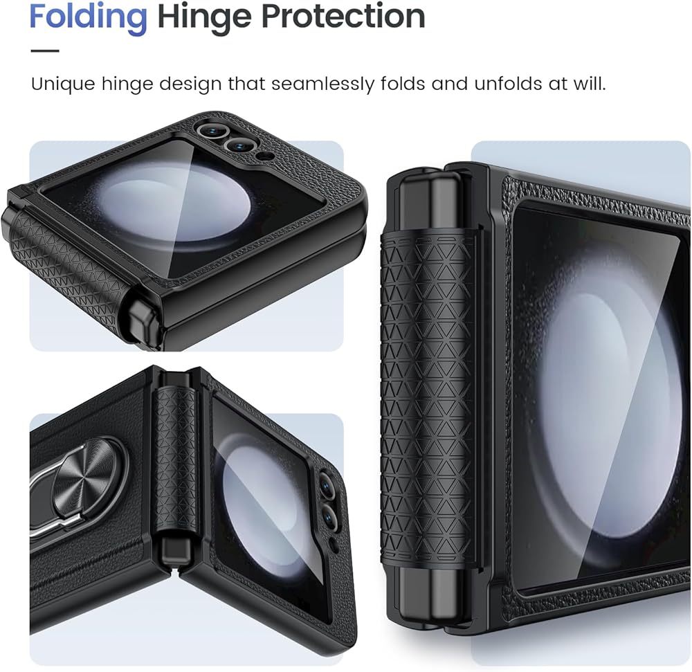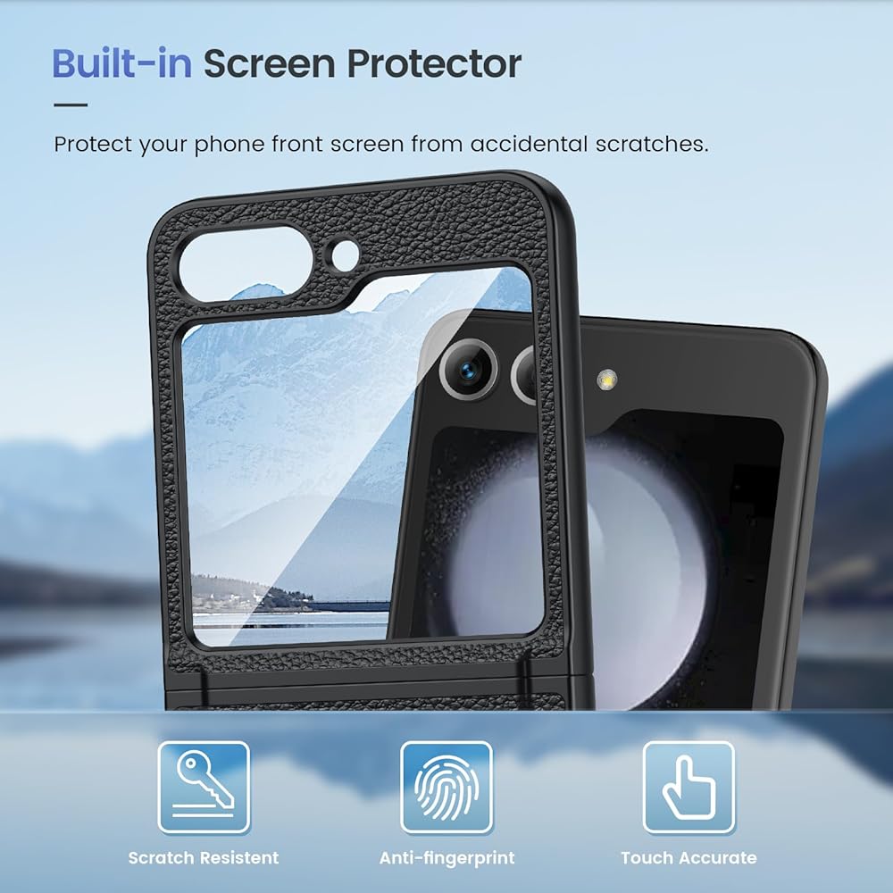 【Built-in Screen Protector】This Galaxy Z flip 5 case has an built-in tempered glass front screen protector to protect your phone from scratches, drops and shocks.