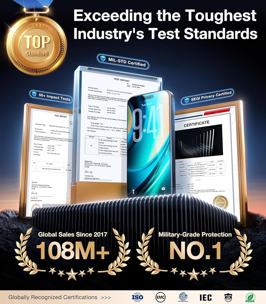 💎【Industry NO.1 Military Grade Shatterproof】 Authorized by International Military Standard with 12 rigorous engineering tests of 220lbs impact, 8ft drops, 10,000+ scratch tests, its strength, toughness and durability perform NO.1 among all glass.