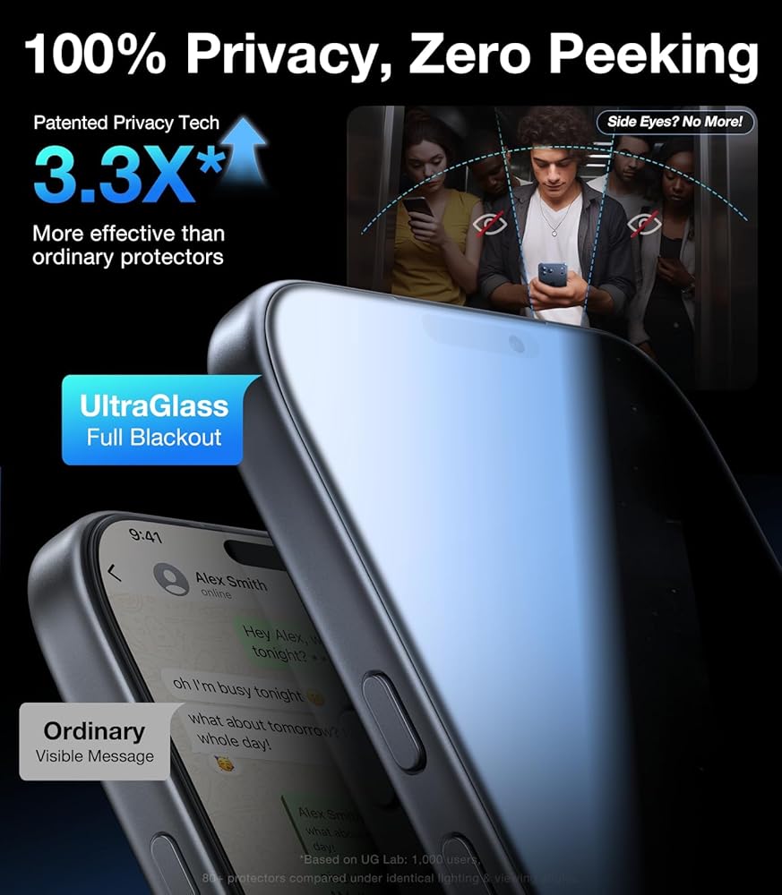 💎【Stealth HD privacy screen, redefining your expectations of privacy glass】this pioneering protector offers an ultra-narrow 25° privacy angle, providing a broad 130° anti-spying range. In any setting, onlookers will see nothing but a deep black screen. Thanks to advanced AR technology, the screen delivers the clearest screen visibility on the market. You can enjoy an unparalleled HD experience, all while safeguarding your on-screen information in complete privacy.
