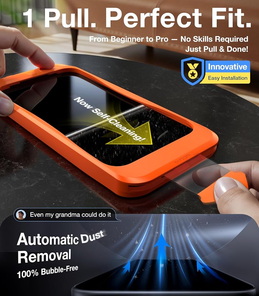 🥇【Revolutionary Auto- Dusting & Adhesive - So Easy Installation】Includes everything you need with innovative automatic positioning, dust removal, and absorption technology, making the installation is just effortlessly easy in seconds. Anyone can be an expert in applying this Screen Protector iPhone without Air Bubbles or Imperfections. Plus, our specialists are always online for you. Say goodbye to the annoying flaws.