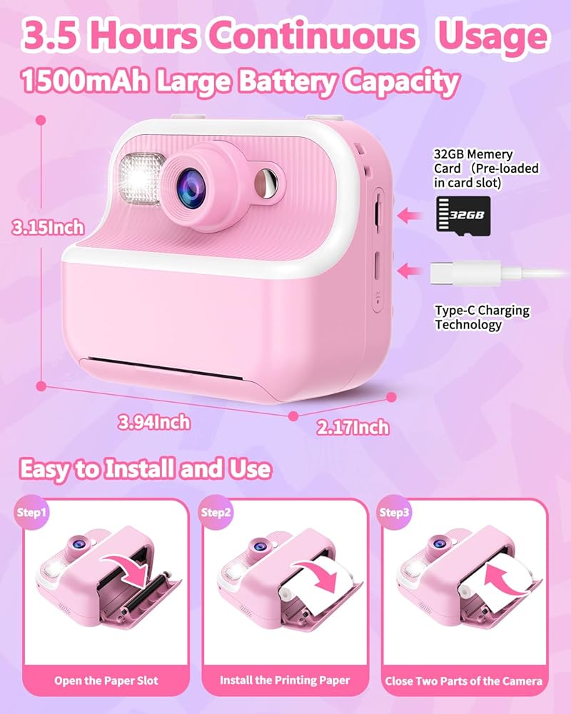 💙【Powerful Battery Life & Large Storage】With a built-in 1500 mAh rechargeable battery, our kids instant print camera adopts Type-C charging technology thus saving time with faster charge speed. Continuously taking photos for 3-4 hours after fully charged. Come with a 32GB SD card to store thousands of photos and supports downloading music in MP3 format. Let the children enjoy a happy playtime and give them a good childhood!