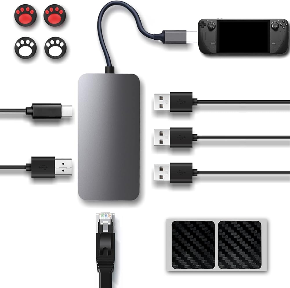 Steam Deck Dock, AOLION 6 in 1 Steamdeck 4K TV Docking Station USB C Hub Multiport Adapter with HDMI/USB 3.0 / Type C/Ethernet Port, 2 Protect Sticker and 4 Thumb Grip Caps for Stream Deck Console