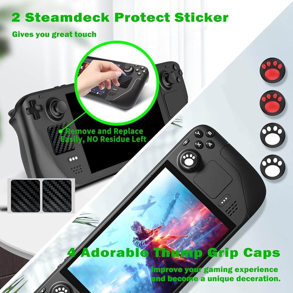 2 Protect Sticker & 4 Thump Grip Caps - AOLION choose non - dry glue to produce the Steamdeck protect sticker, so you can easily remove and replace them with NO residue left behind. Made of the highest quality automotive materials, it gives you great touch and meawhile enhance the texture of your Steam Deck game console. 2 pair of cat claw thump grip caps not only improve your gaming experience, but also becomes a super unique deceration for your Stream Deck console.