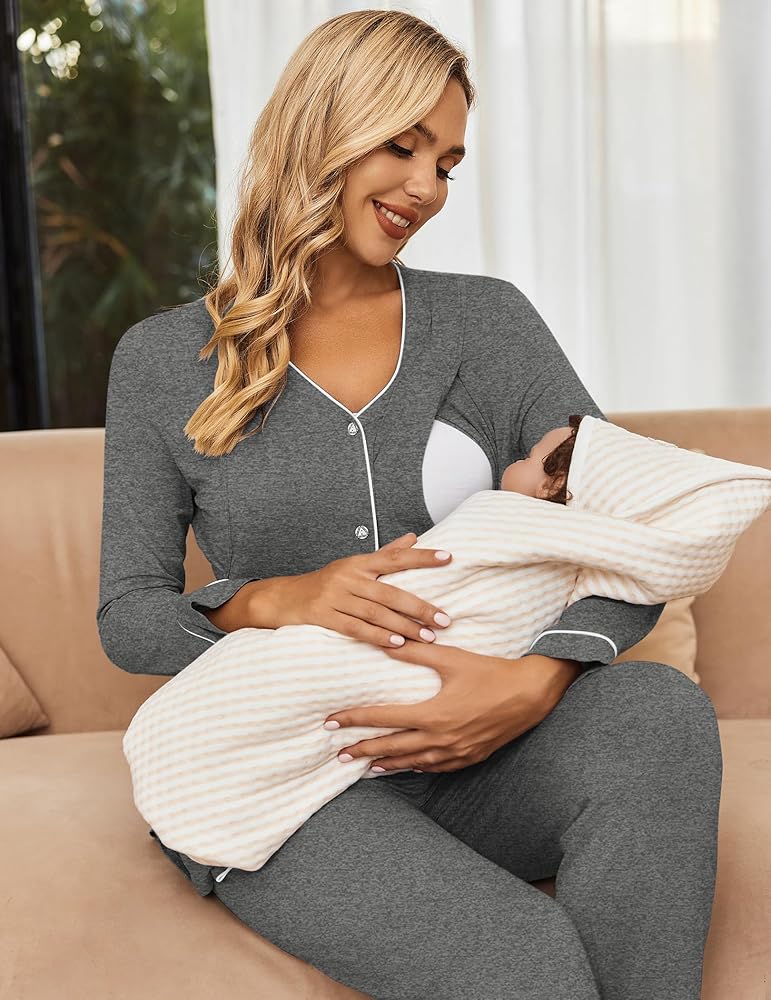 EASY ACCESS FOR NURSING: The maternity pajamas has easy access for nursing. These were helpful to let you breastfeed and be comfortably modest in front of guests. The nursing access of the PJs can accommodate nursing on both sides, so you can tandem feed twins at the same time. This practical nursing nightwear is perfect for sleeping,lounging around at home and hospital, nice nursing loungewear helps you easily enjoy your motherhood.