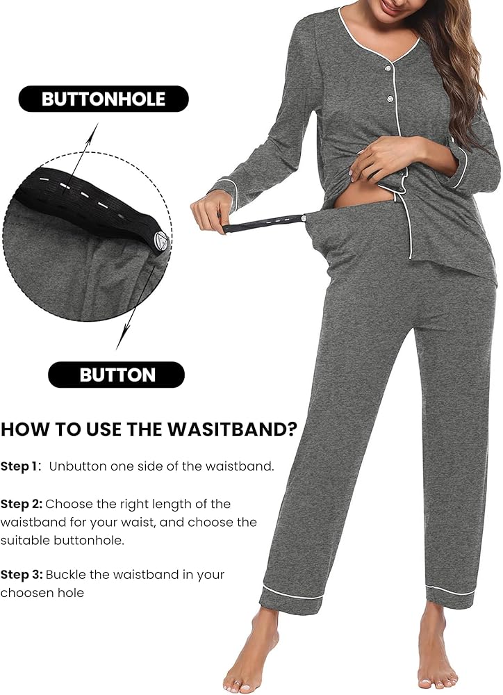 ADJUSTABLE WAISTBAND: This 2pc maternity breastfeeding sleepwear set includes a soft and comfortable long sleeves top and long pregnancy pants. The elastic waistband is adjustable, makes it roomy and you can let them out when the bump grows. Elastic waistband with elastic button extenders for easy transition from pregnancy to postpartum use. You can get the best fit size by adjusting the length of the elastic waistband. It's easy and practical, strong but doesn't hurt.