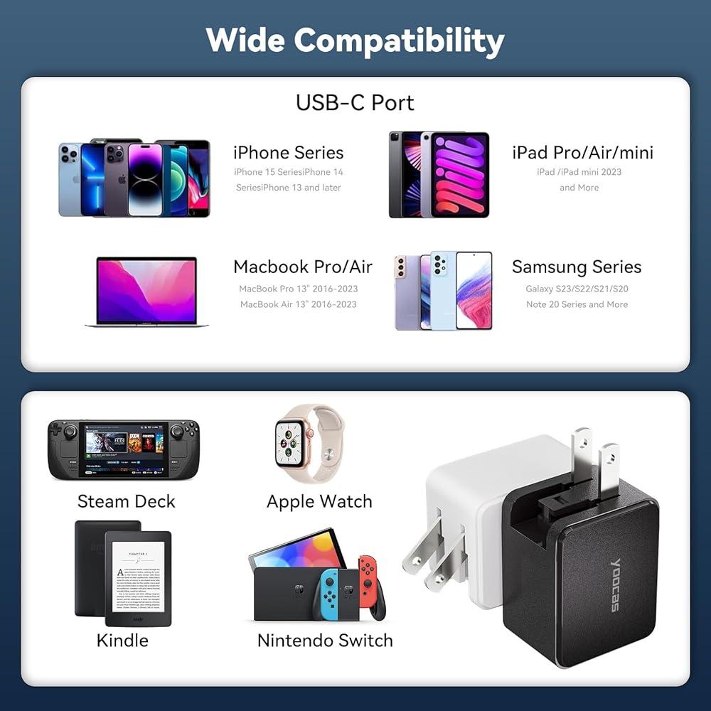 【التركيز على سلامتك】مع الشريحة الذكية بالداخل، يتطابق شاحن الحائط Yoocas USB C مع التيار حسب حاجة جهازك تلقائيًا. يتم اختبار منتجاتنا وفحصها بعدة طرق قبل مغادرتها المستودع لحماية أجهزتك من التيار الزائد، والشحن الزائد، والجهد الزائد، وارتفاع درجة الحرارة، والمزيد.