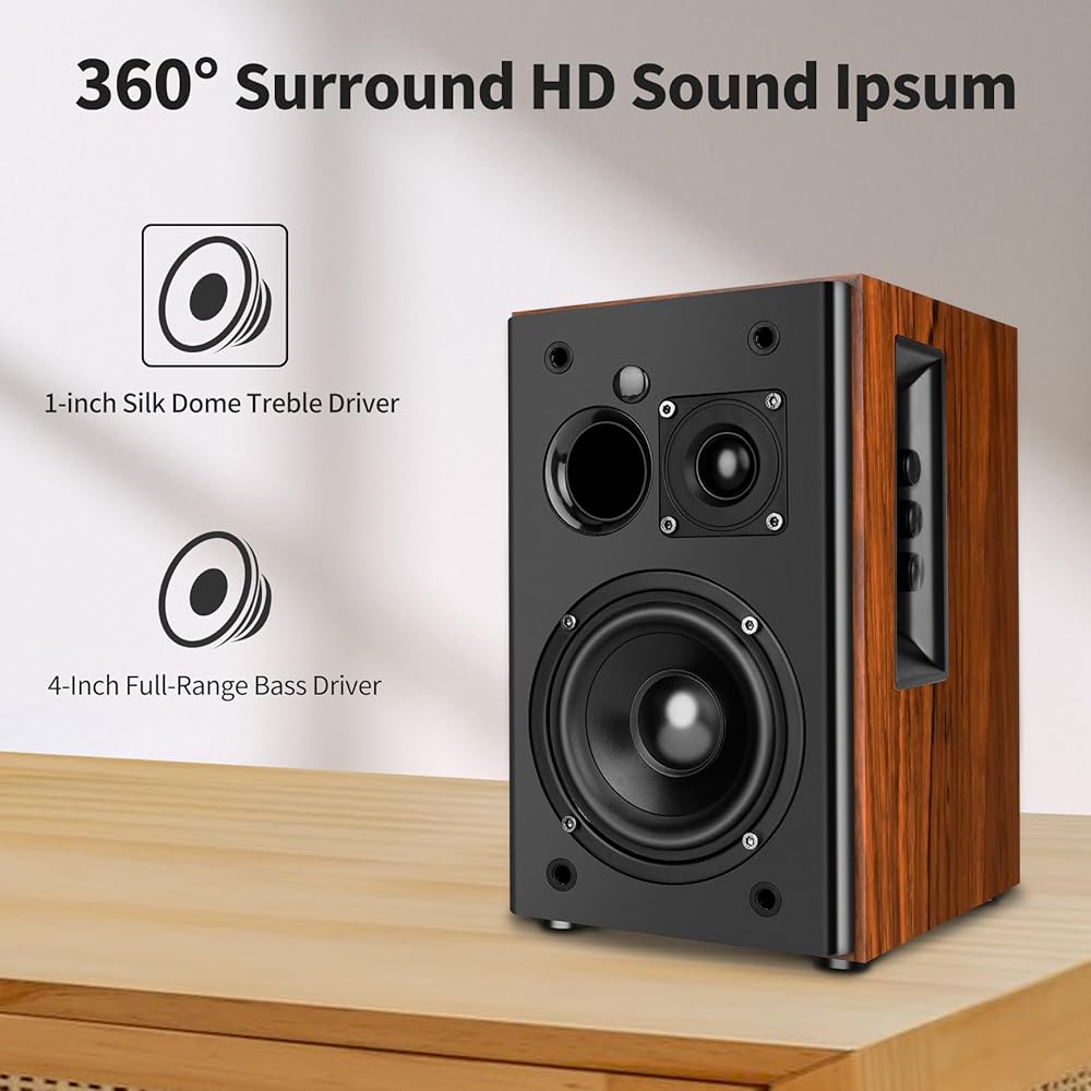 [4 inch Retro Styled Bookshelf Speakers] The bookshelf speaker's enclosure is finished in the latest high-quality MDF wood and plastic face cap finish, and features a built-in 4-inch poly cone woofer and 0.75-inch silk dome tweeter that delivers deep, powerful bass that effectively reduces crackling, making it ideal for music aficionados, cinema enthusiasts and gamers alike.