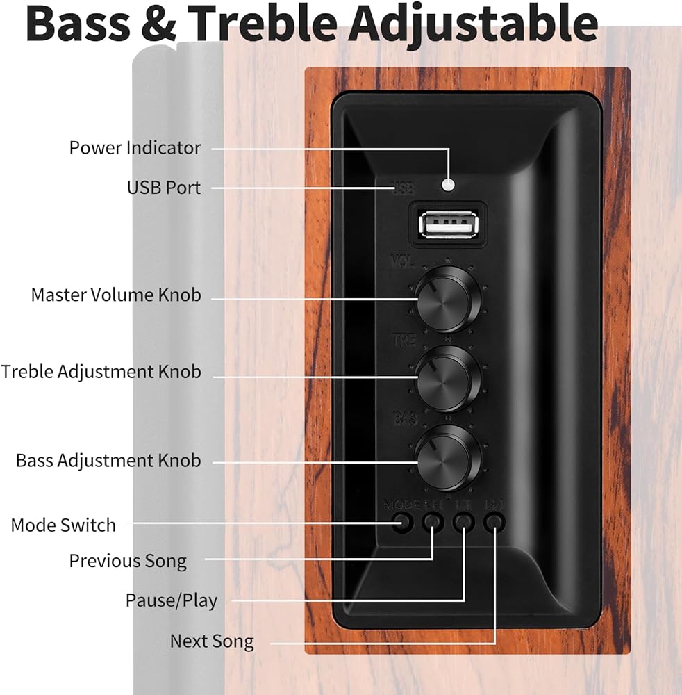 [Remote and Button Control] The near-field speaker comes with a remote control that allows you to adjust volume and switch inputs at your finger. You can also make an advanced sound adjustment with the bass and treble controller located on the side of the main speaker. Note: The remote control is not compatible with the TV remote or universal remote.