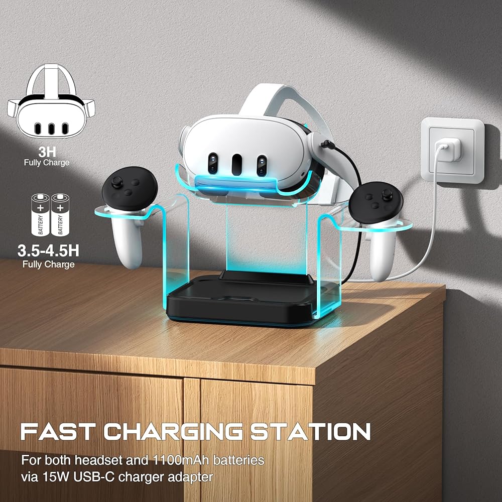 Space-Saving: The vr headset charger dock for meta quest 2 and 3 not only charges your devices but also serves as a storage and display stand for both the headset,controllers and other vr accessories, saving space and keeping your gaming area organized. There is protective films on the three transparent holder, please tear off it before using.