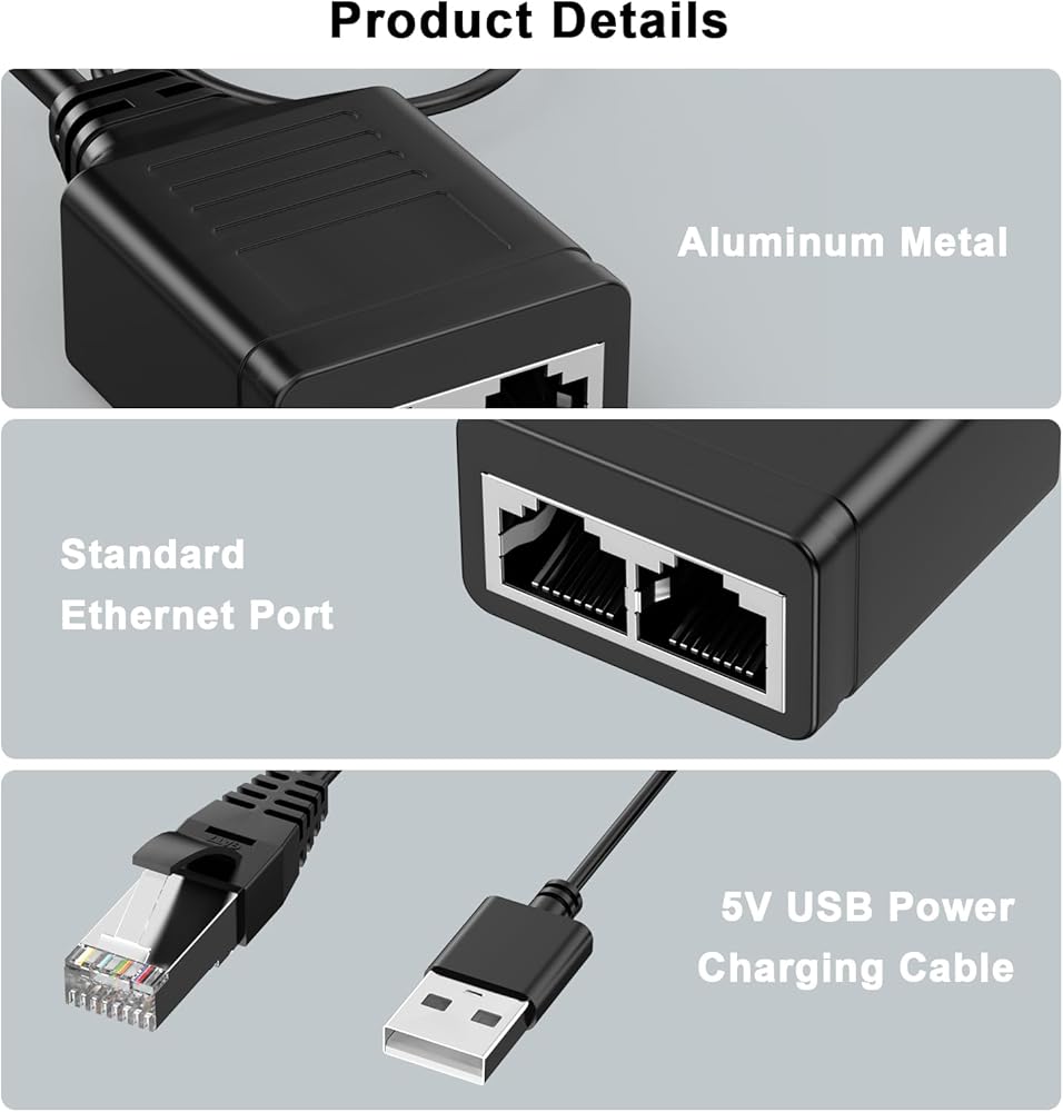 RJ45 Network Splitter is mainly used to solve the connection problem caused by insufficient wiring, use the USB power supply cable and support three computers to share one ethernet cable simultaneously by means of the physical tapping method.