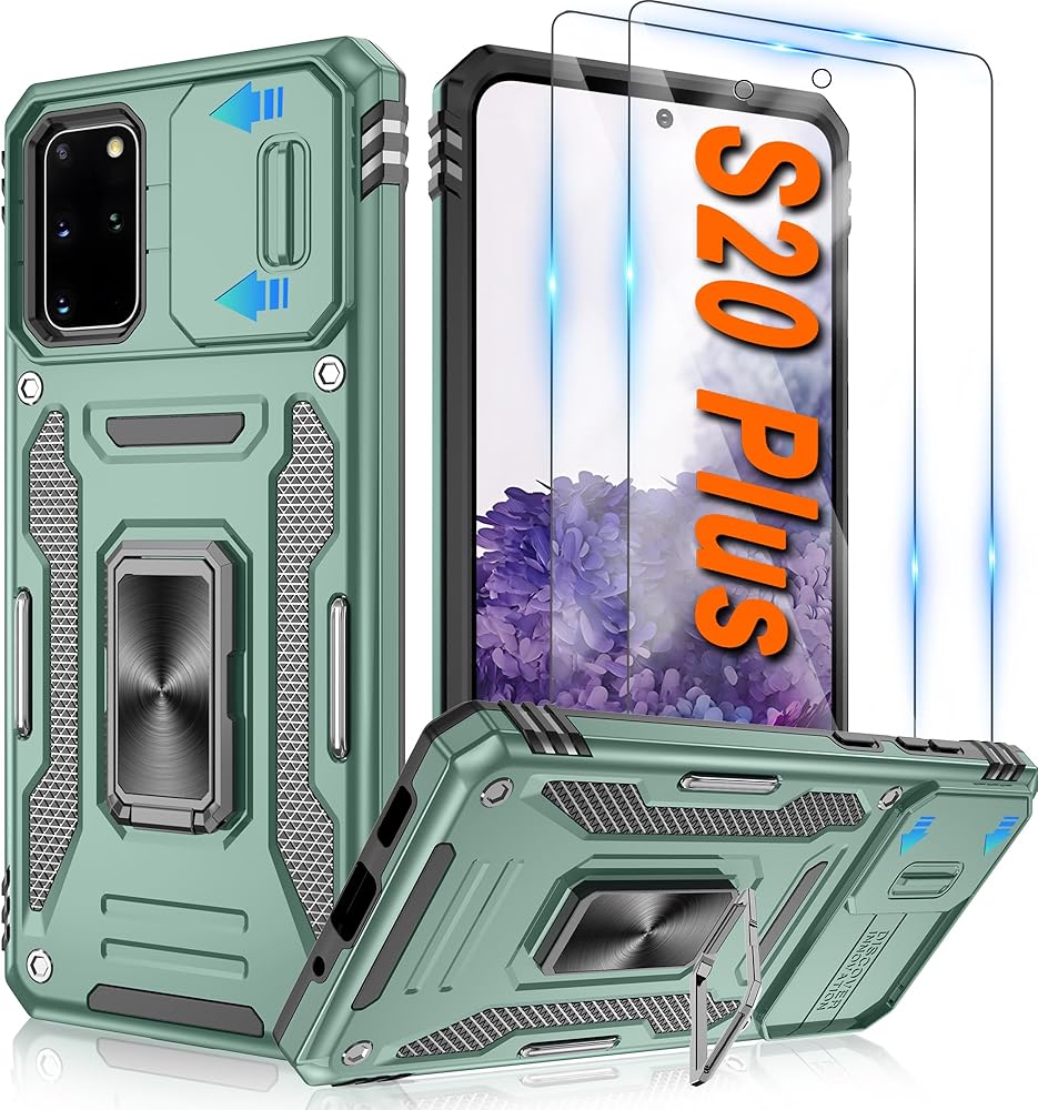 ATUMP for Samsung Galaxy S20 Plus Case with [2 Pack] HD Screen Protector & Slide Camera Cover, 360° Rotation Ring Kickstand [Military Grade] Shockproof Protective Case for Galaxy S20+, Alpine Green